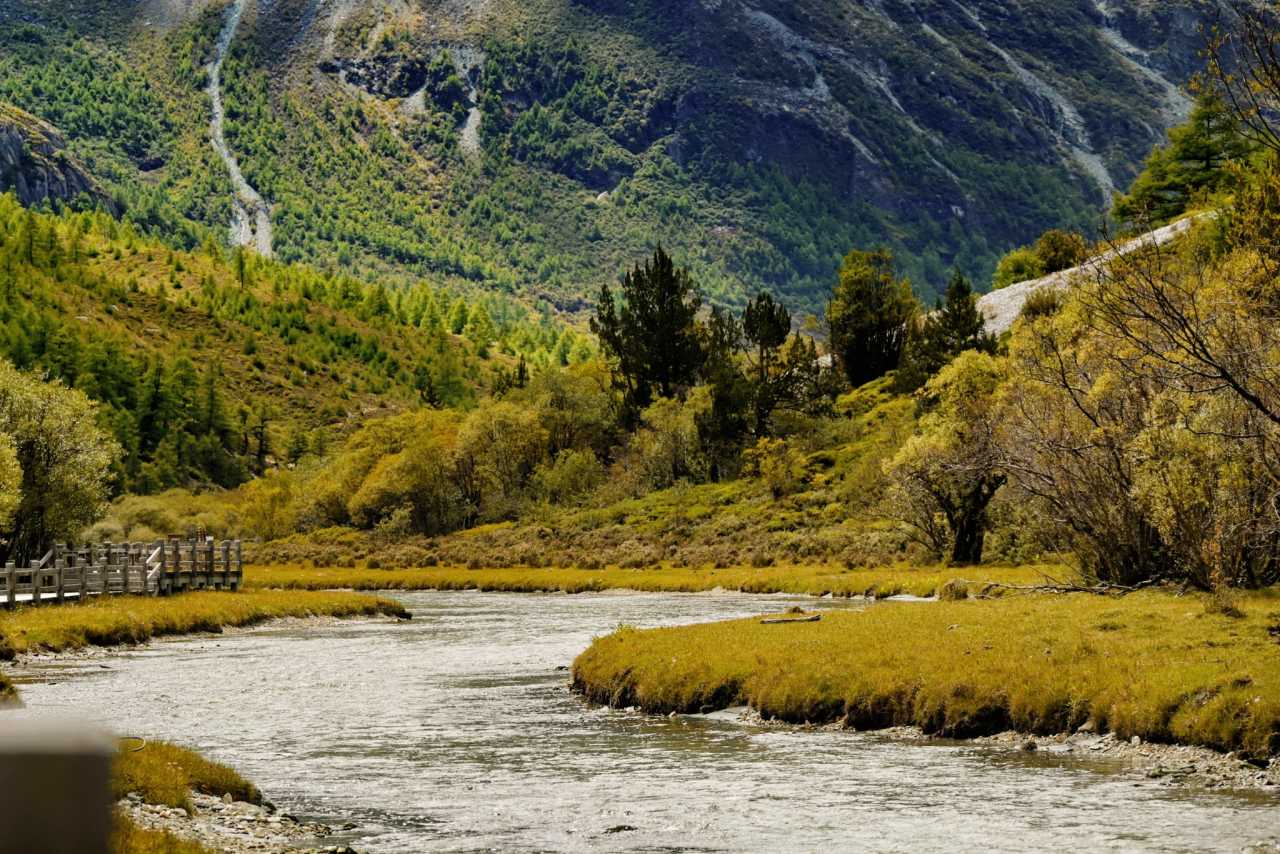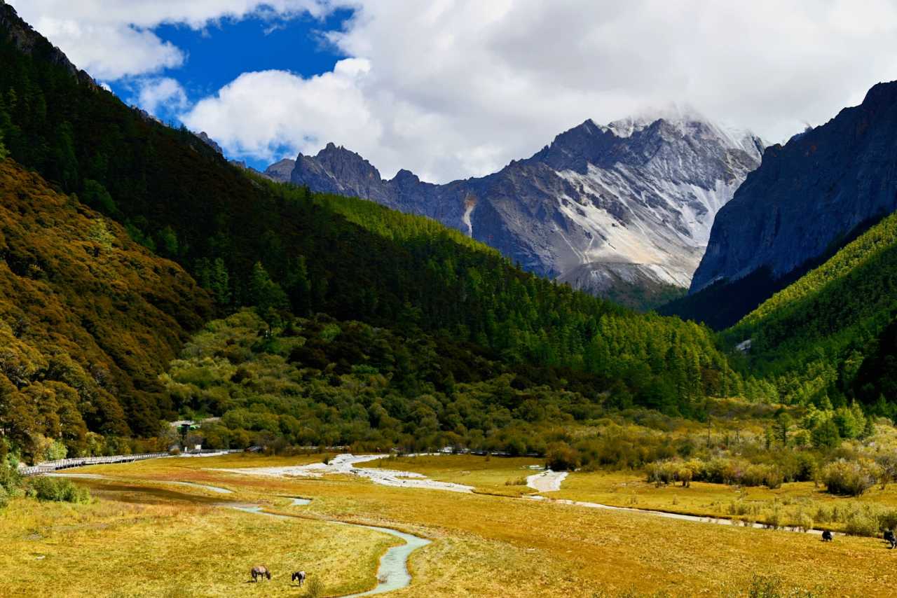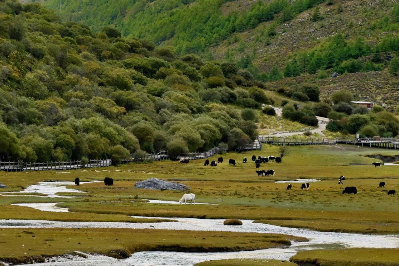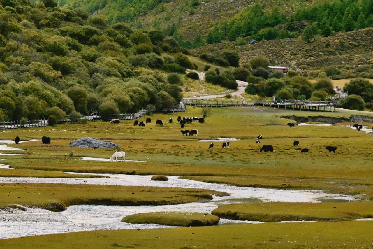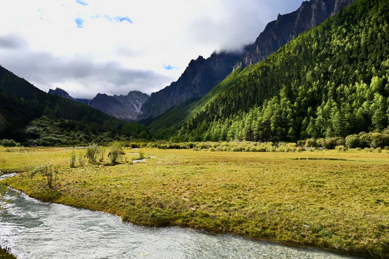Daocheng Yading – Chonggu MeadowOn sunny days, afternoon light is richest here. The meadow spreads like a giant brocade; streams meander between grasses, water clear and bright.