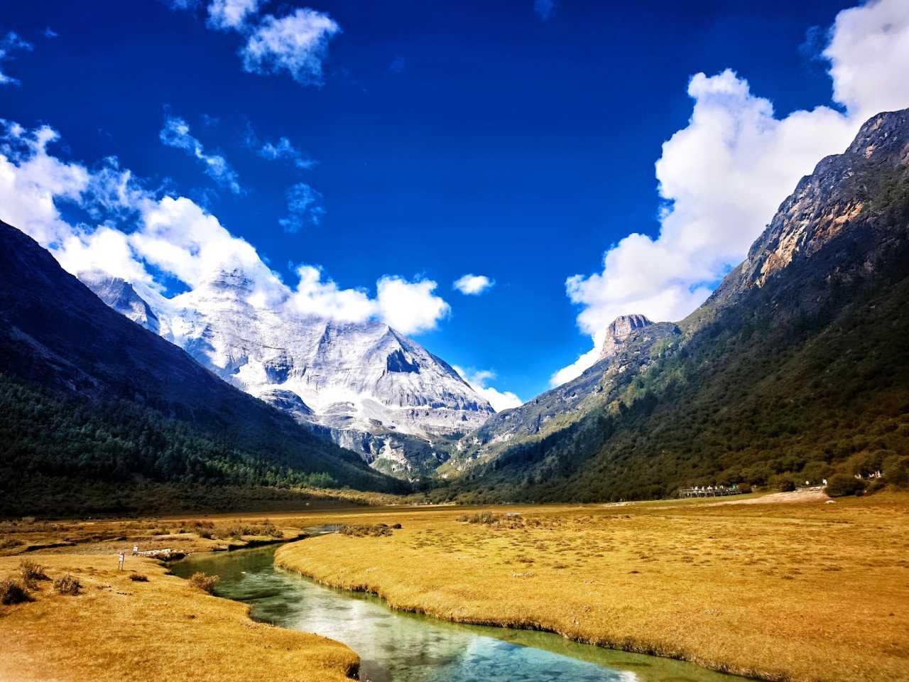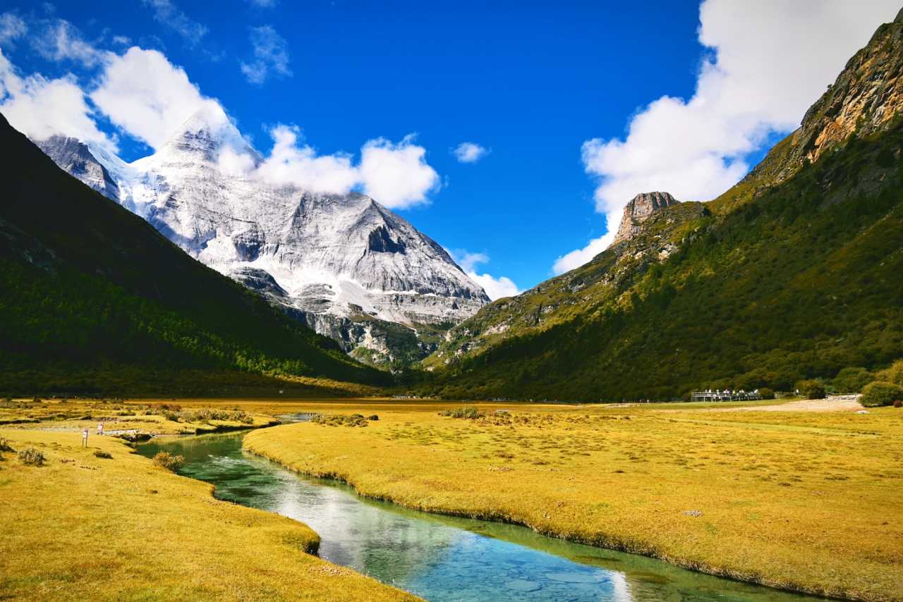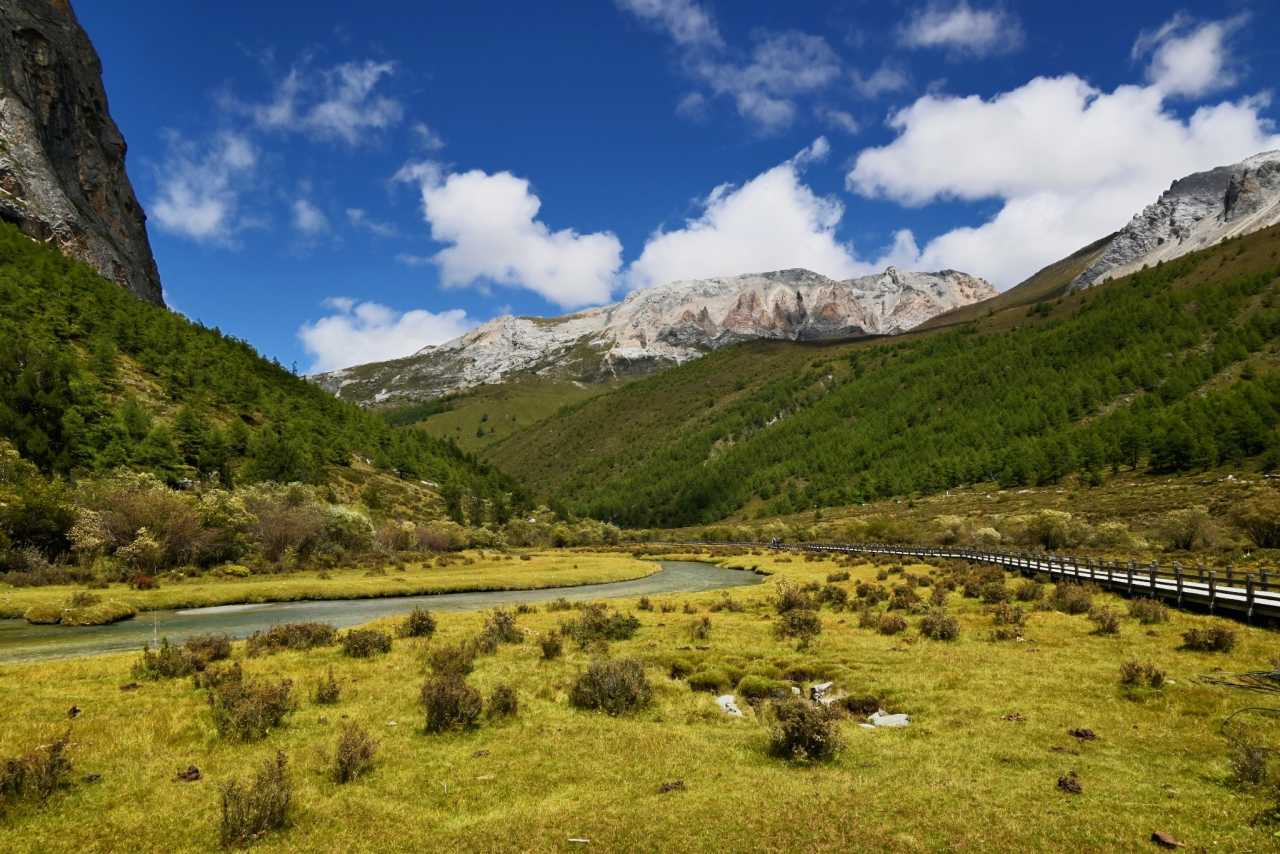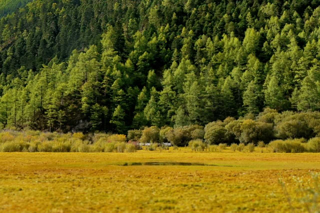 Daocheng Yading – Chonggu MeadowOn sunny days, afternoon light is richest here. The meadow spreads like a giant brocade; streams meander between grasses, water clear and bright.