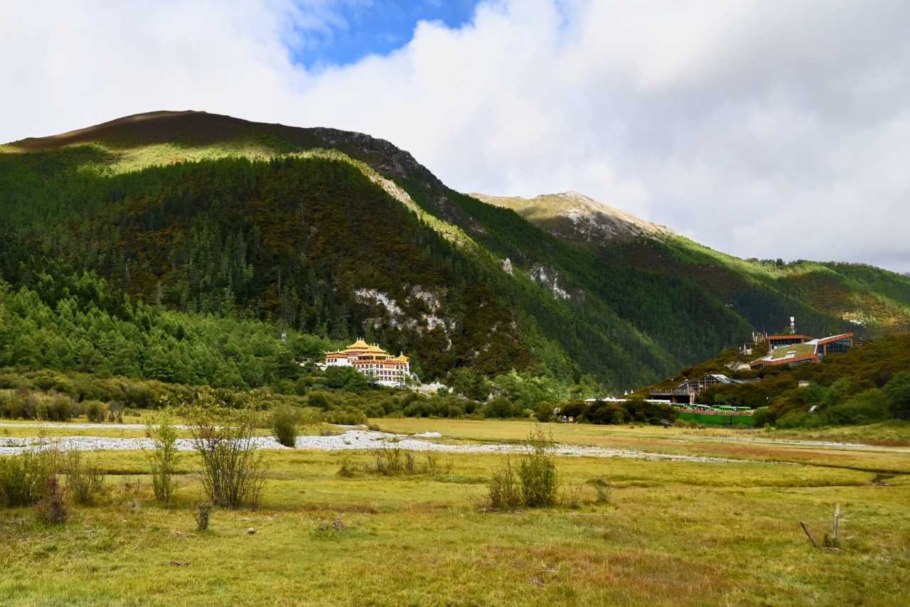 Daocheng Yading – Chonggu MeadowThe meadow is wide-open; even from far you can still see Chonggu Monastery near Zhaguanbeng. White walls and golden roof tucked among swathes of green—feels secluded and hidden in plain sight.