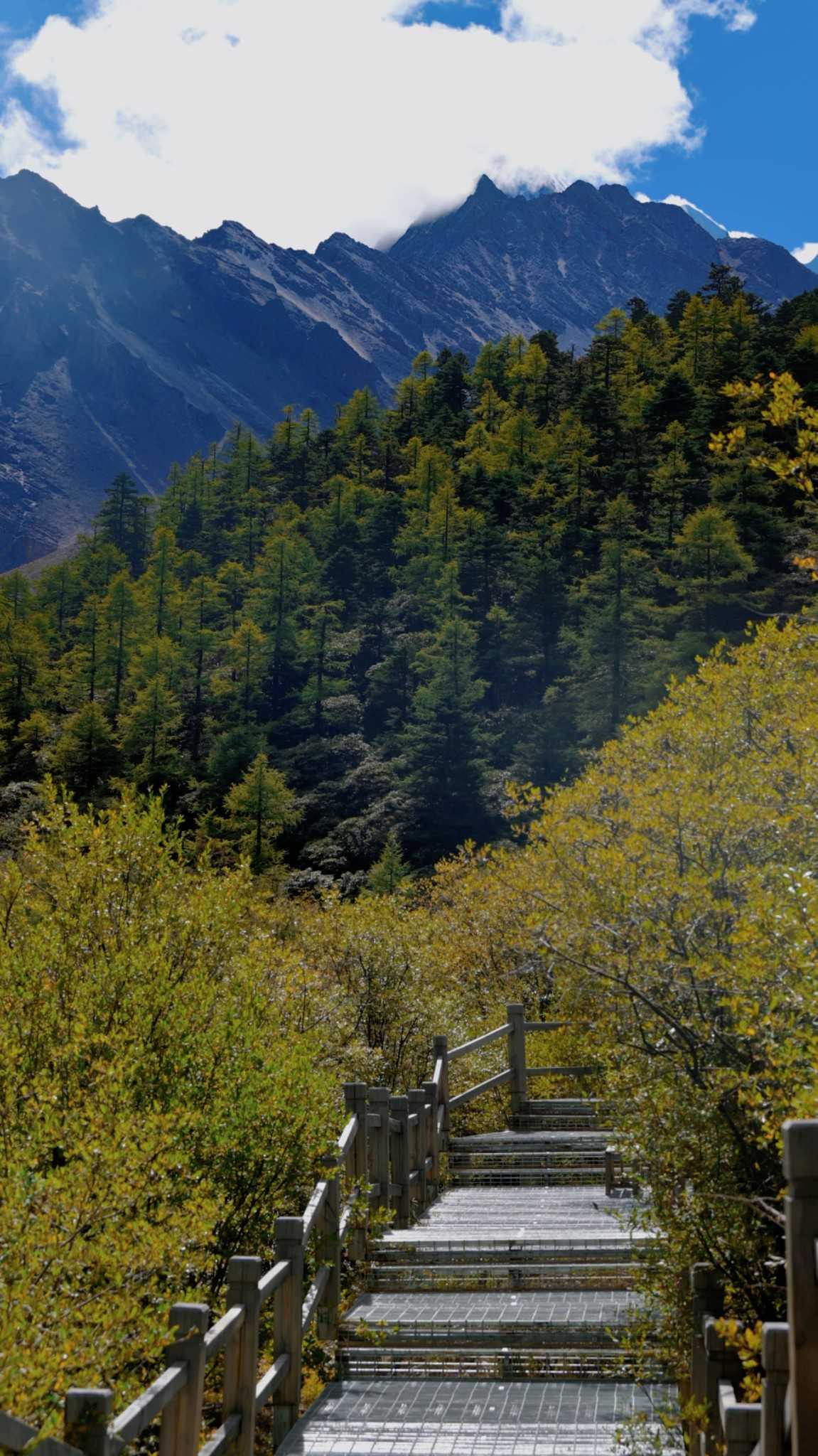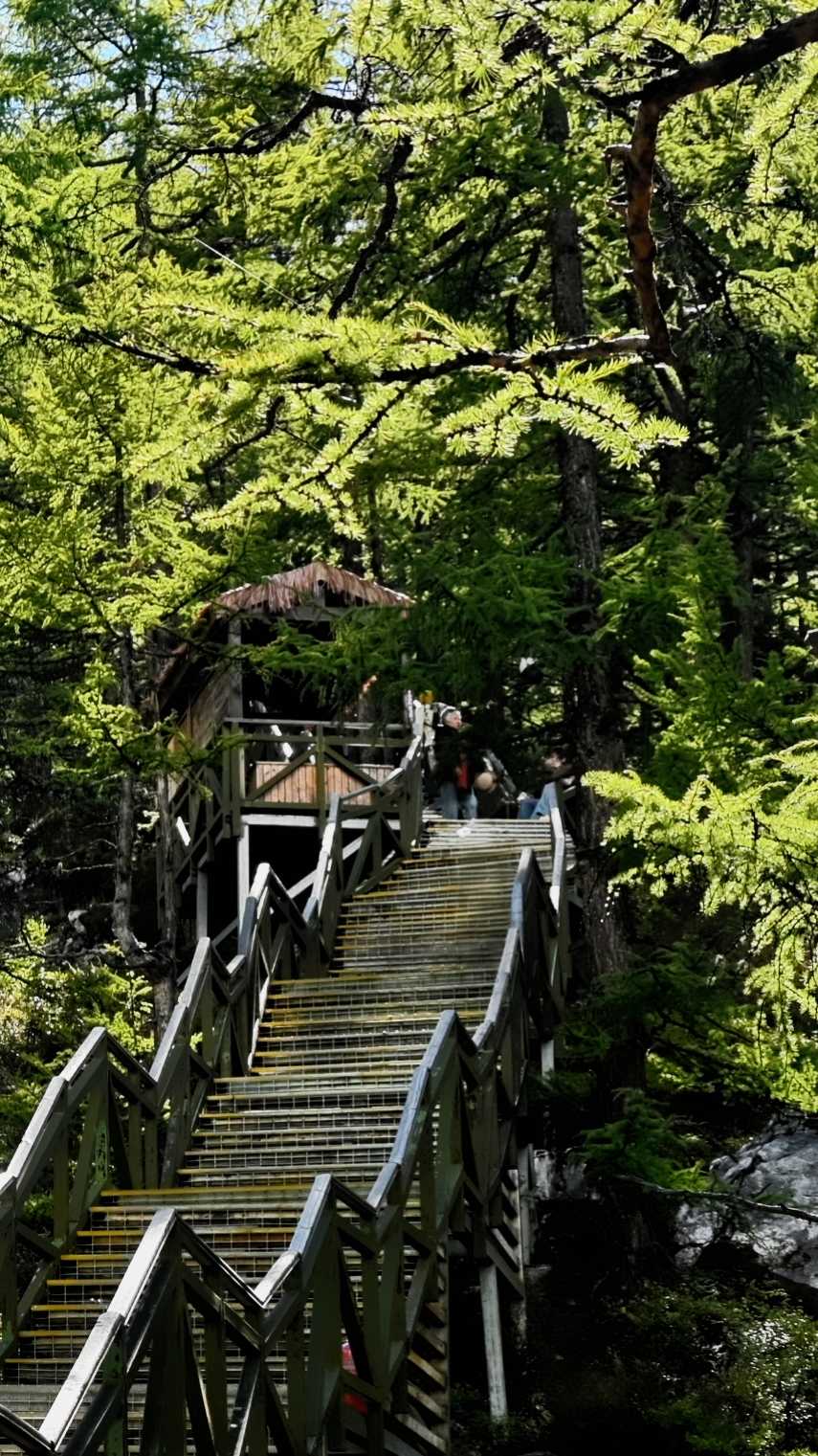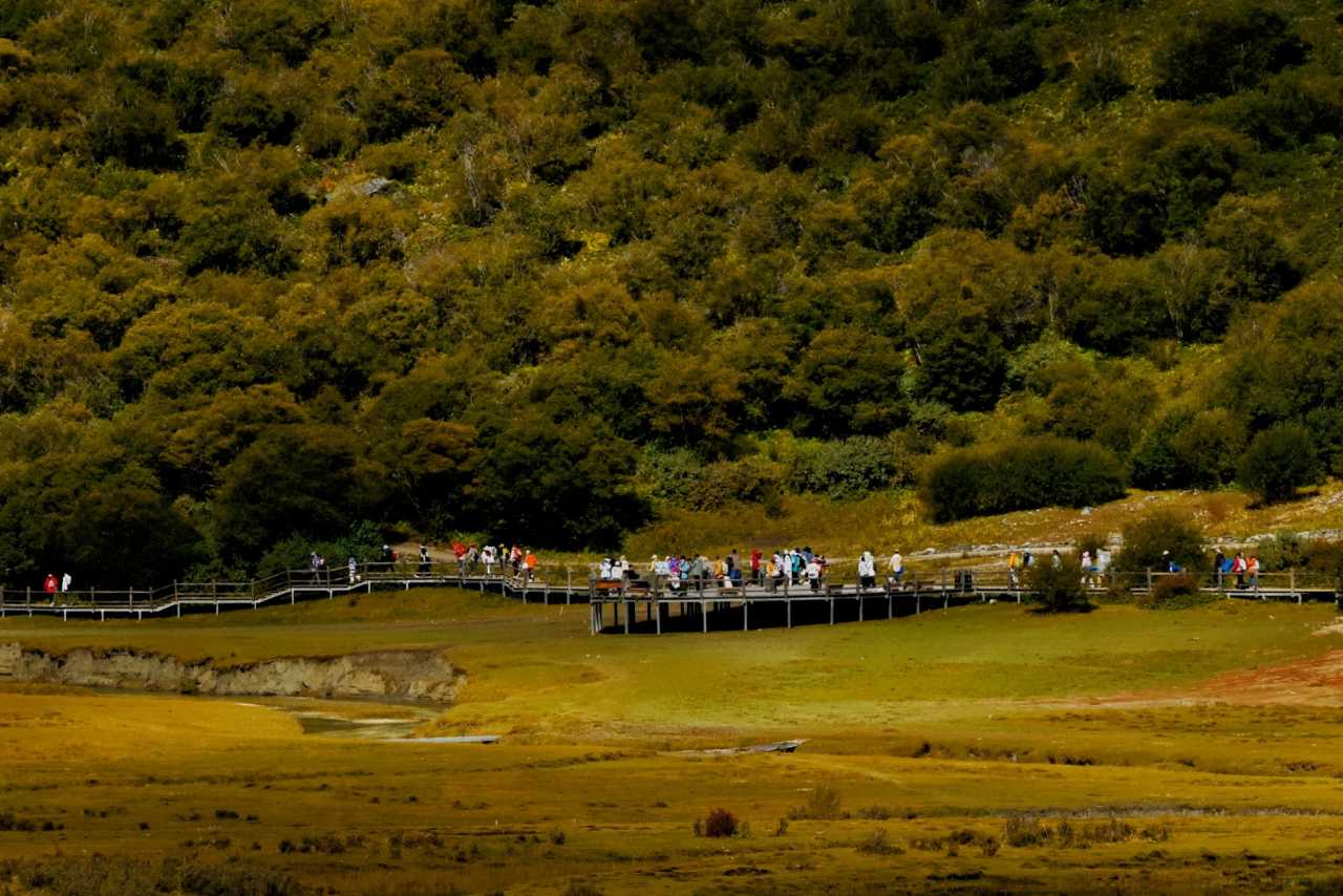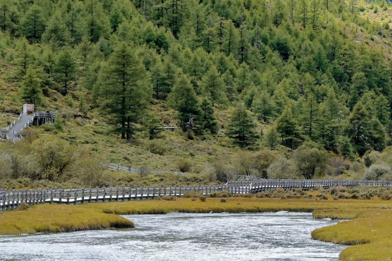 This walkway is almost parallel to the green sightseeing road. The road is slightly higher; the boardwalk sits low, nearly level with lakes, winding through forest—very wild and original—one of the few extremely friendly routes for stamina in Yading.