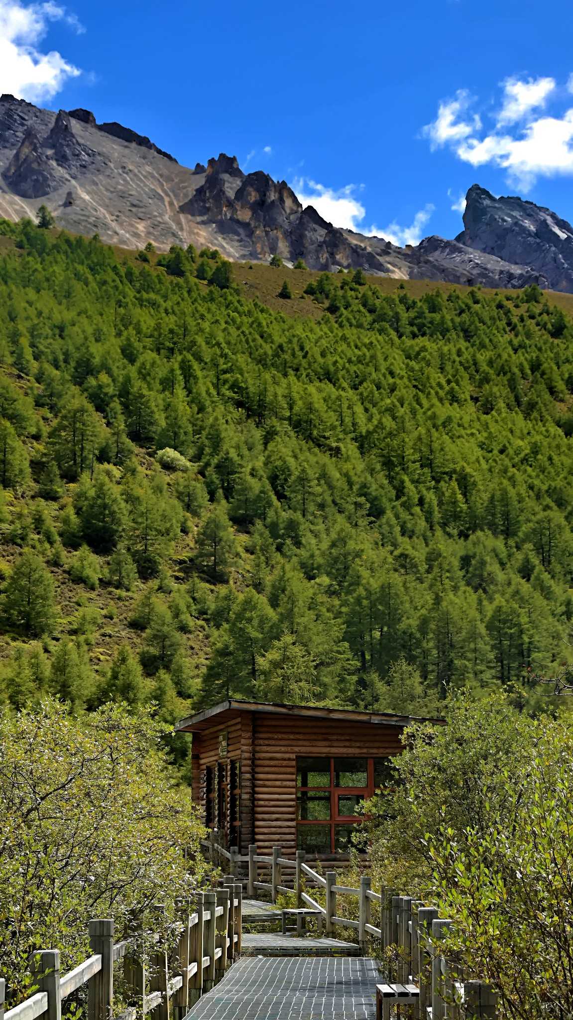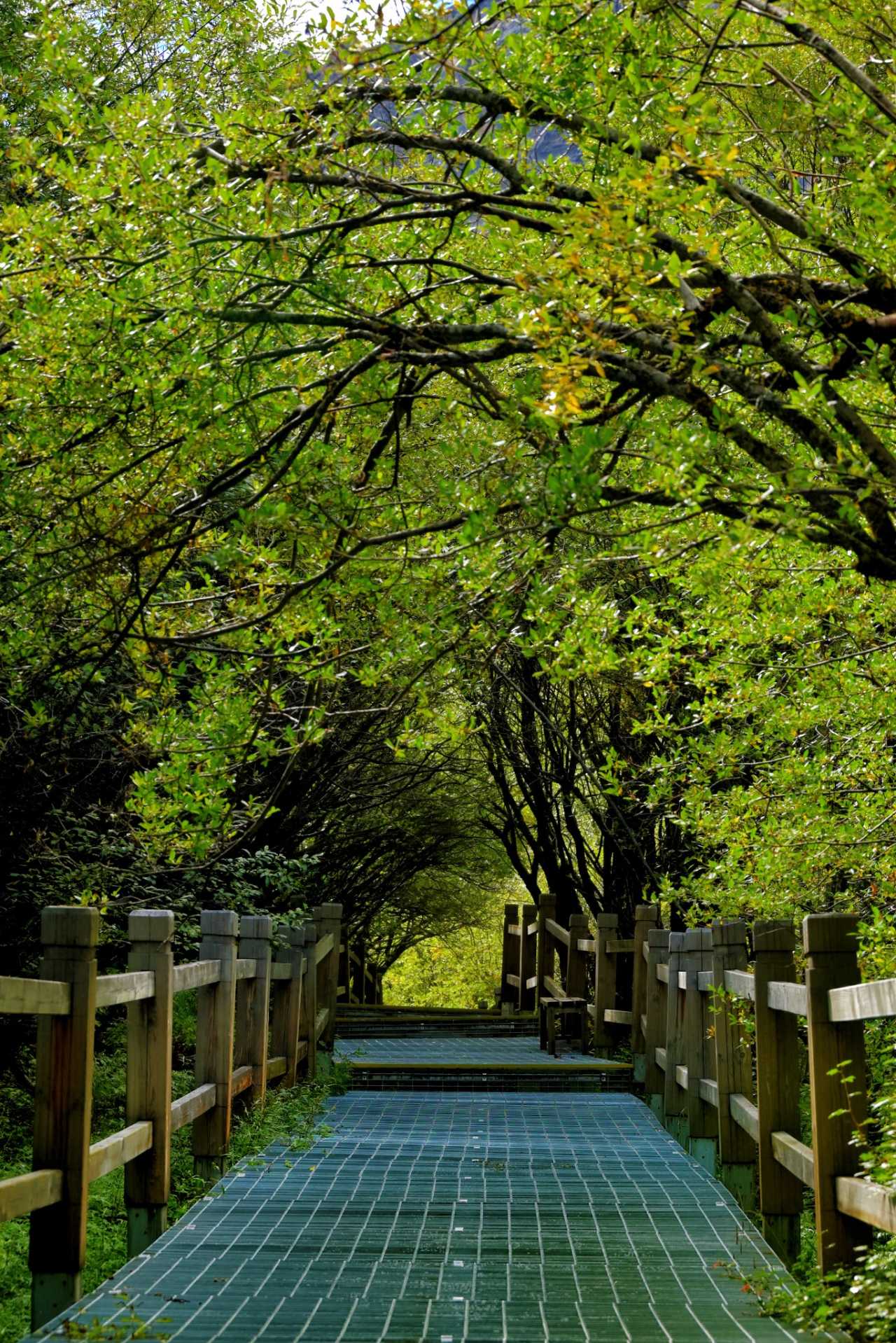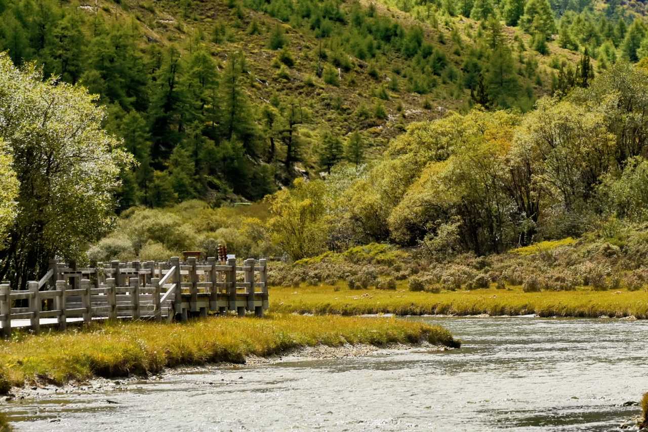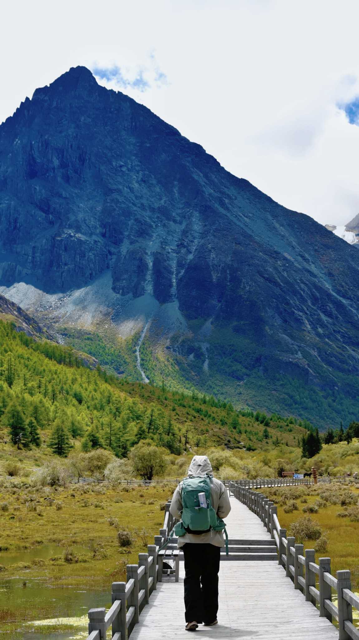 This walkway is almost parallel to the green sightseeing road. The road is slightly higher; the boardwalk sits low, nearly level with lakes, winding through forest—very wild and original—one of the few extremely friendly routes for stamina in Yading.