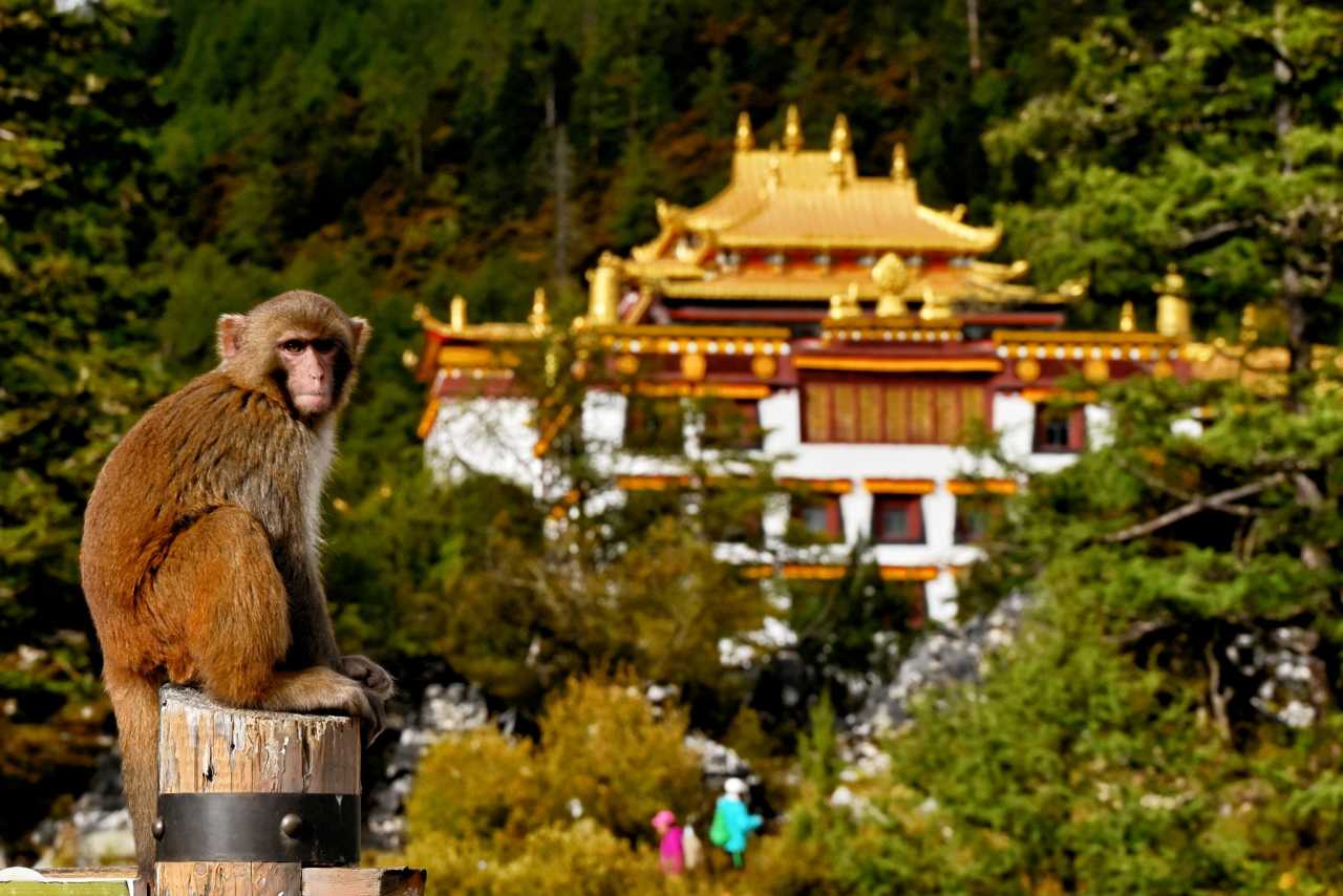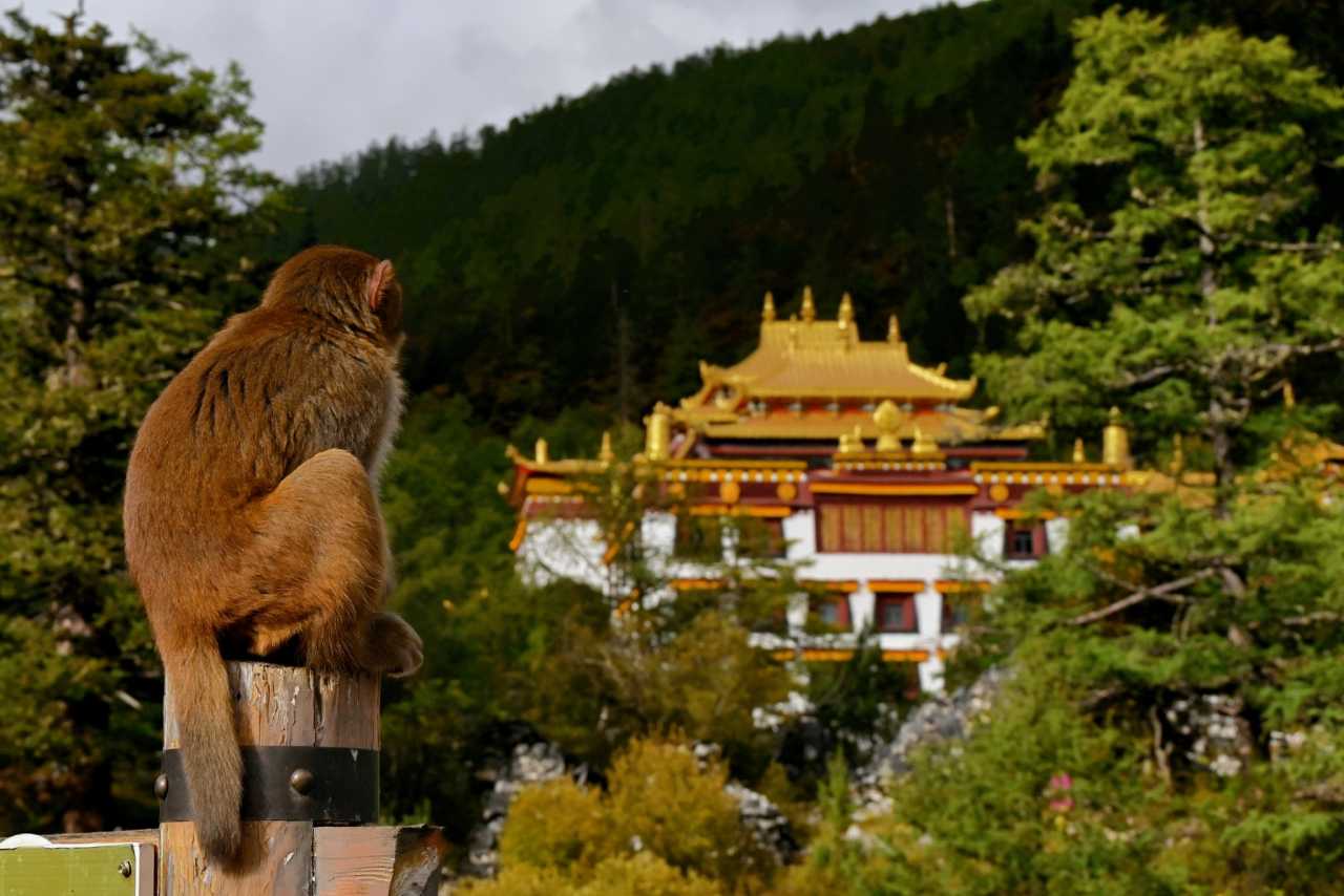 ZhaguanbengGathered visitors and ample food attract many wild Tibetan macaques to “beg.” Plump wild troops sit along the forest edge by the road, eyeing passersby, waiting to “snatch” food from tourists.