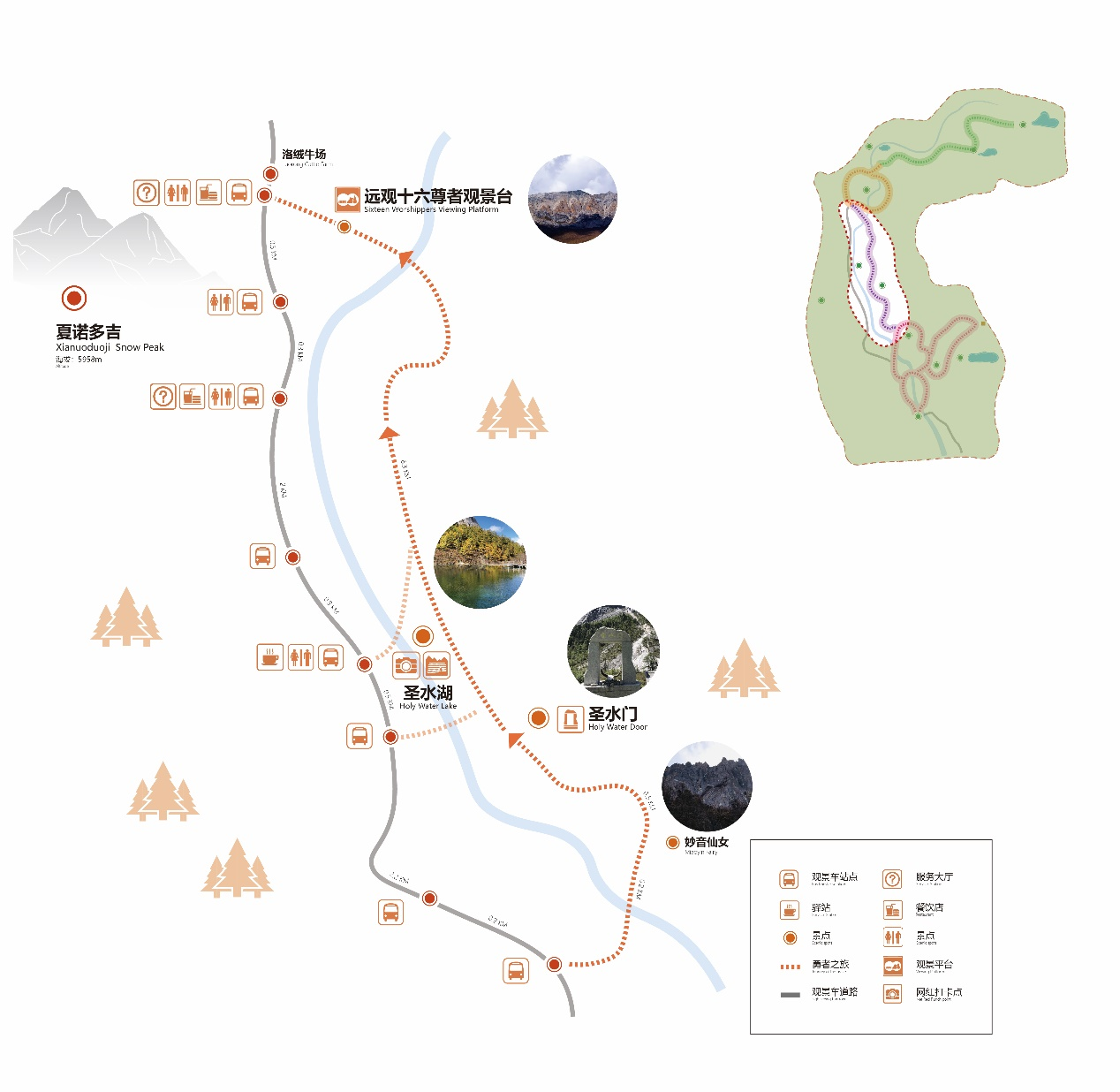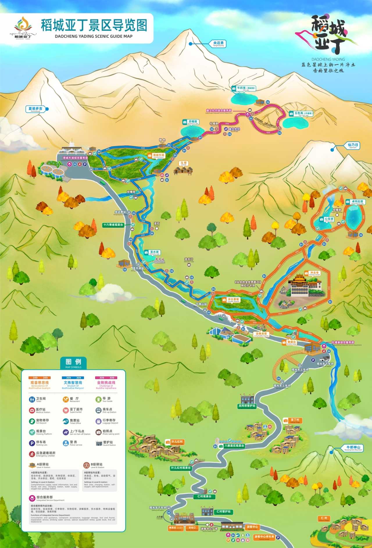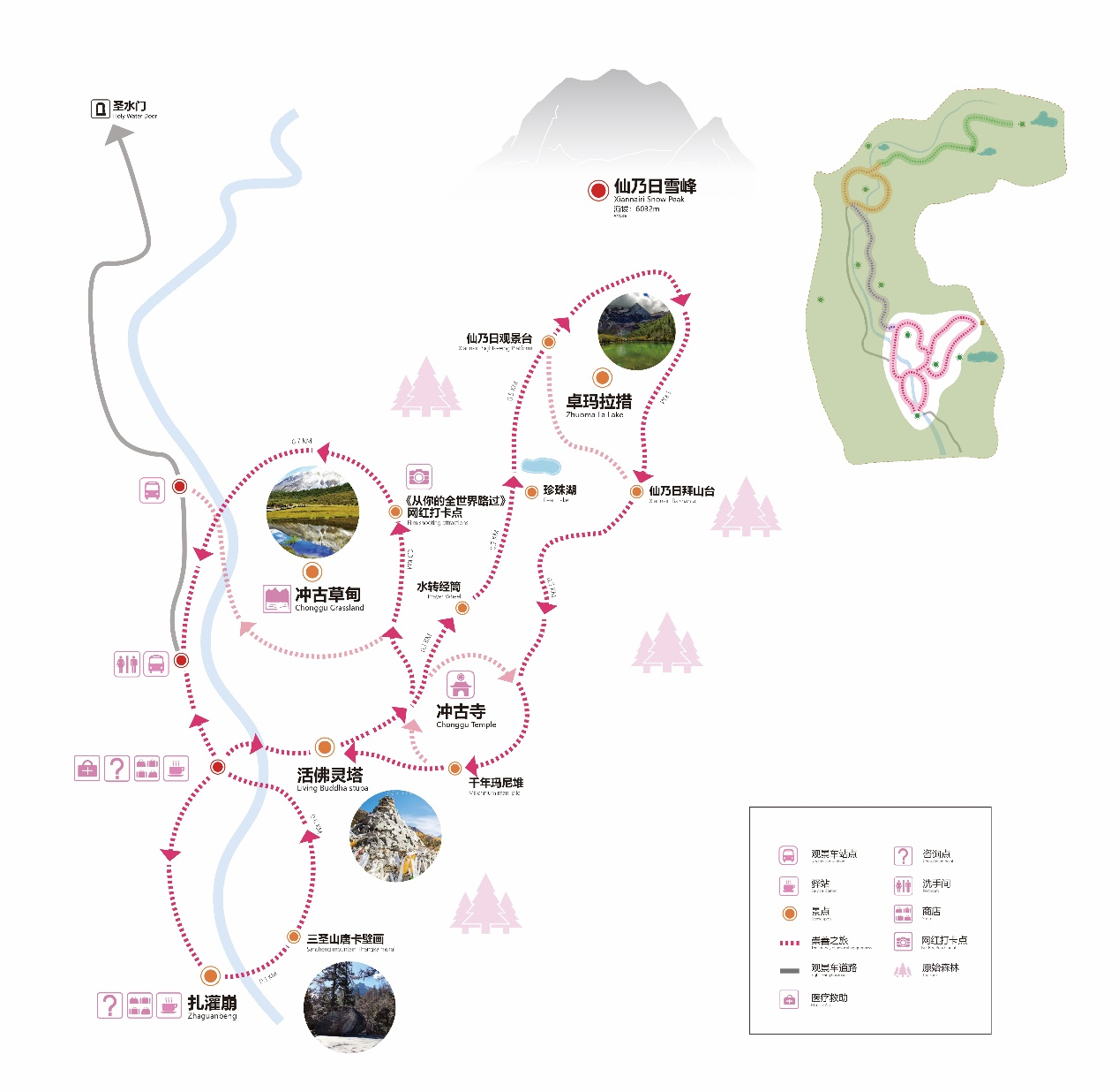Daocheng Yading Scenic AreaYou’ll pass: Chonggu Meadow – 0.7 km – Sacred Water Gate – 0.5 km – Sacred Water Lake – 6.3 km – Distant View of Sixteen Arhats – Luorong Pasture. The trail is a single path, hard to get lost.