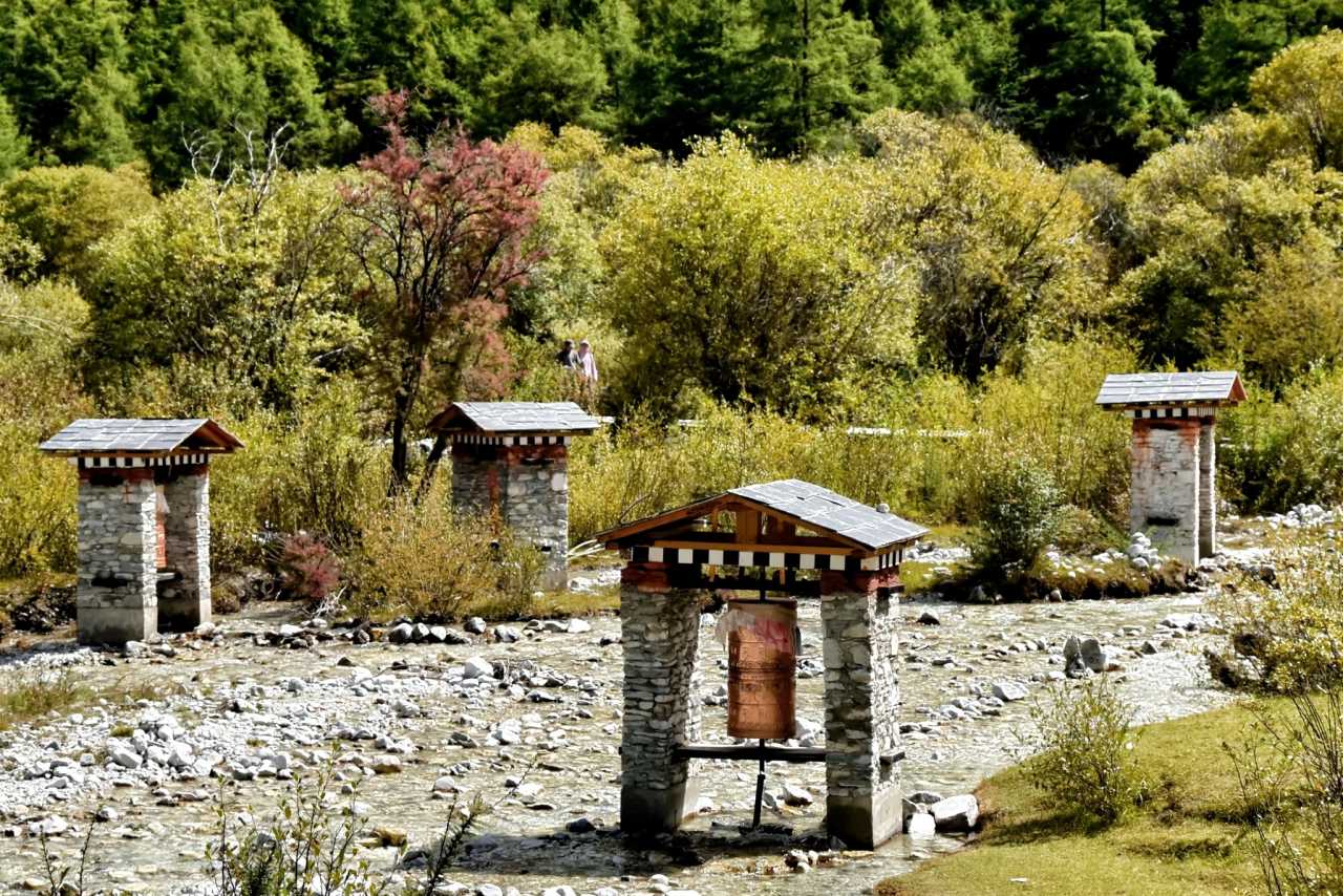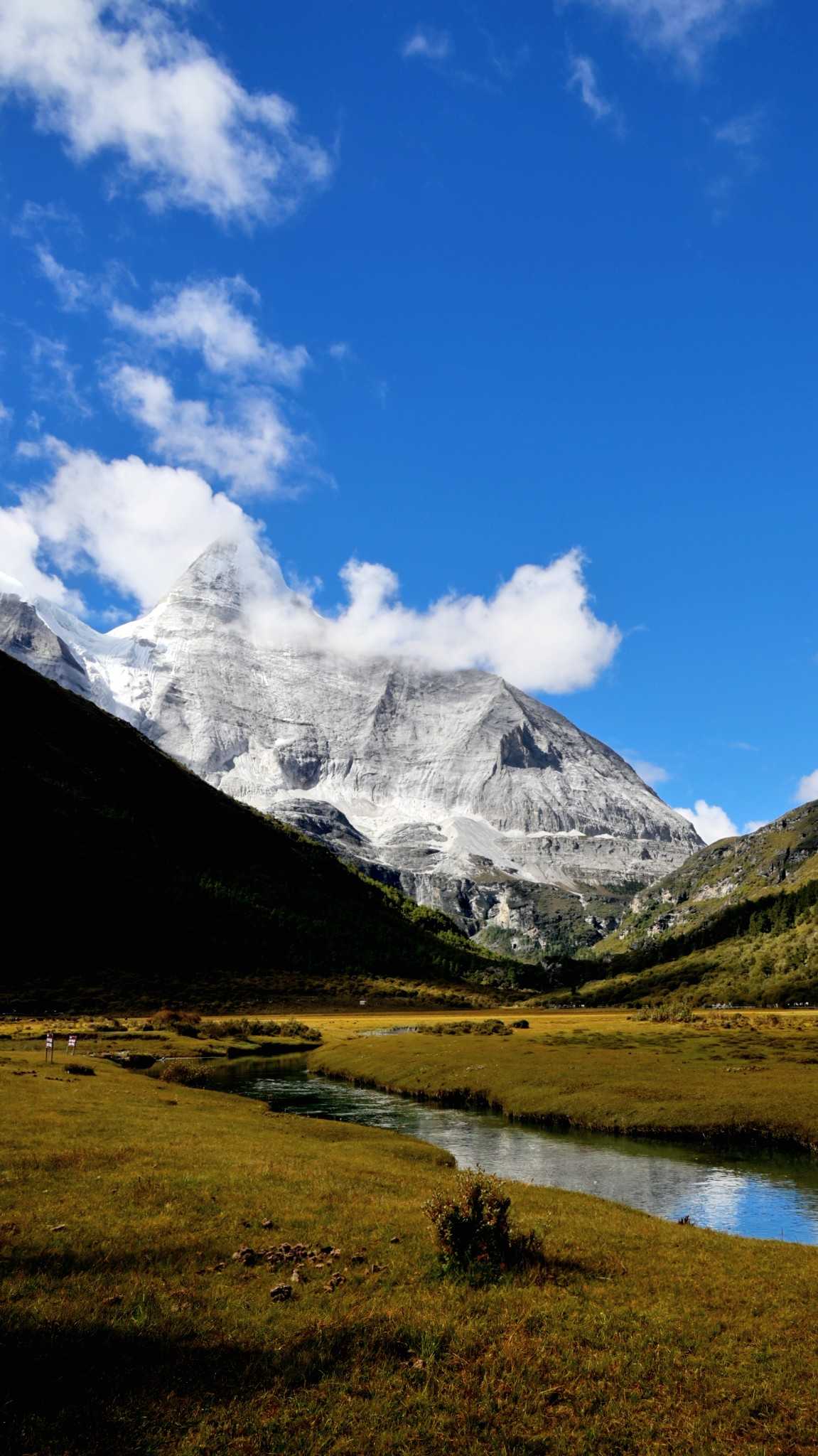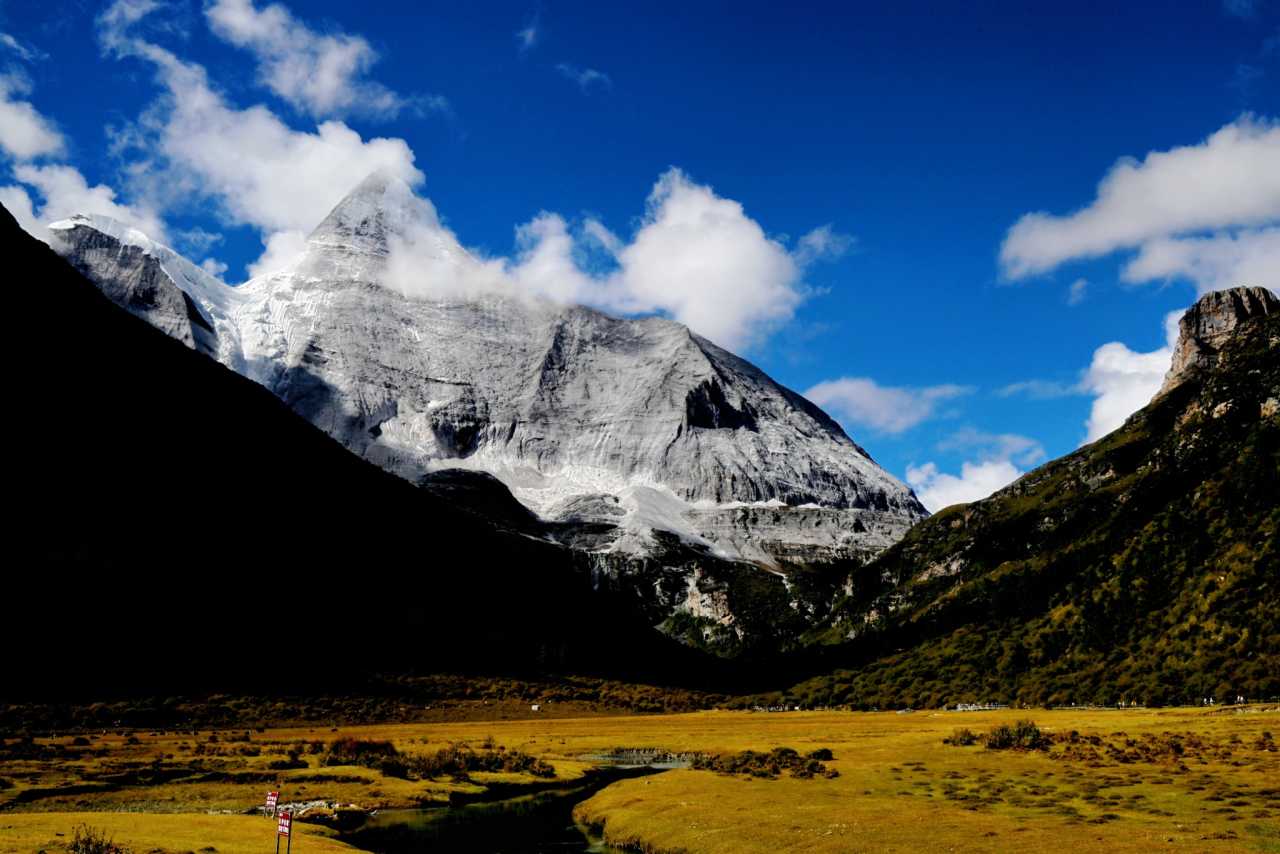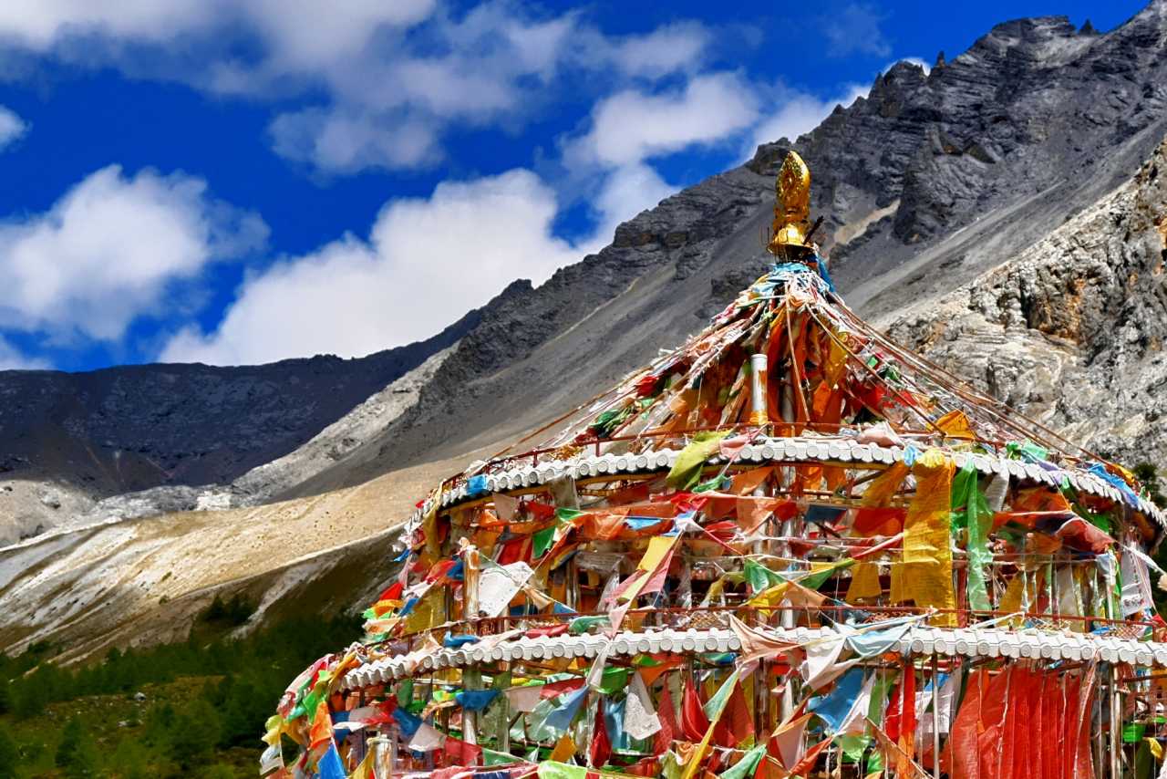 Daocheng Yading – Chonggu MeadowIf lucky to avoid cloud, you can look up to both Xiannairi and Xianuoduoji. If peaks are covered, then look at countless mani piles by the stream; feel wishes in the wind—you can read travelers’ silent hopes placed upon stones.