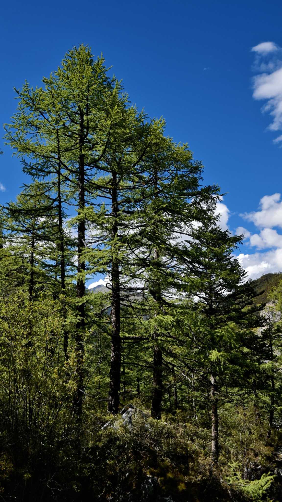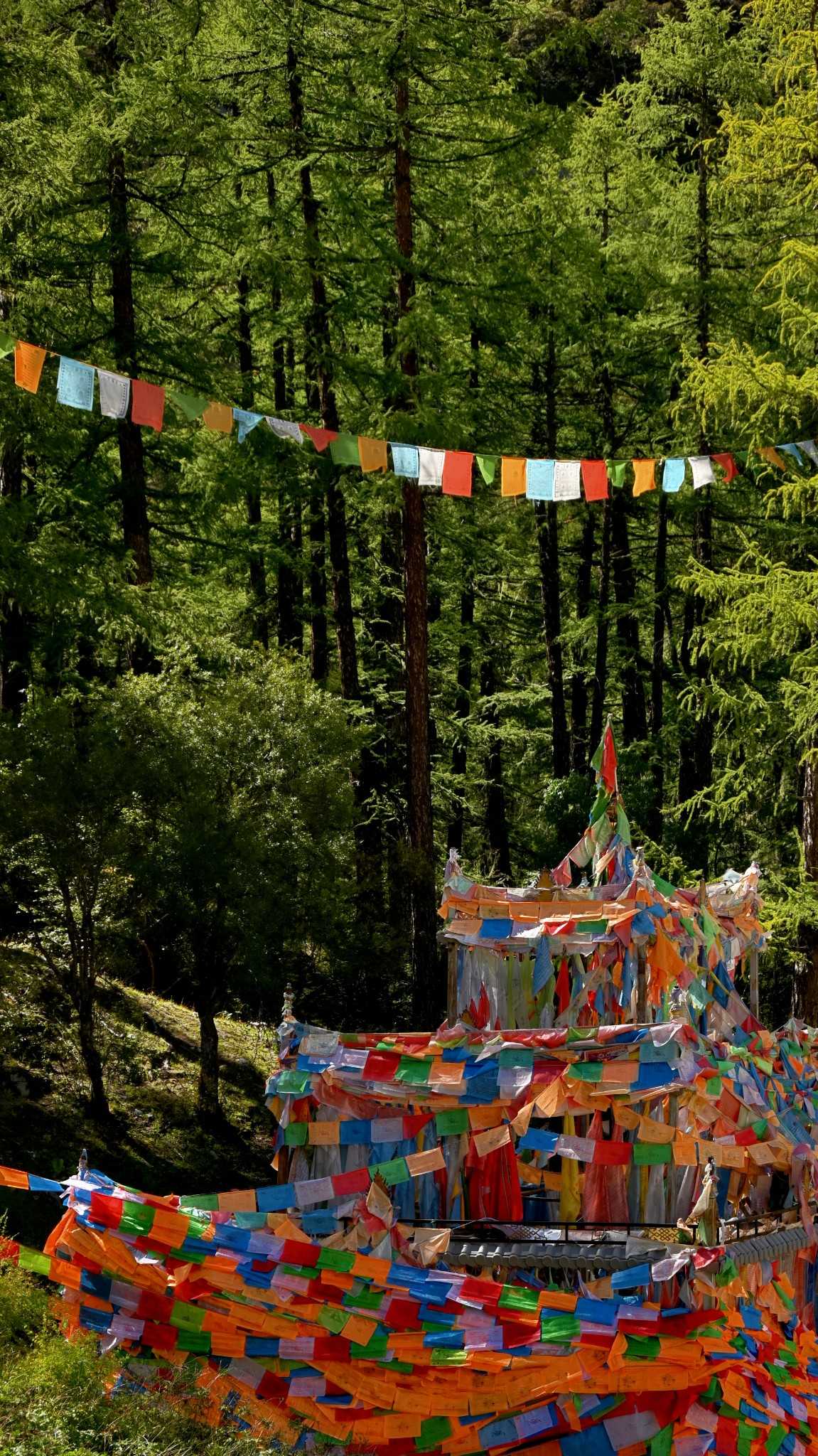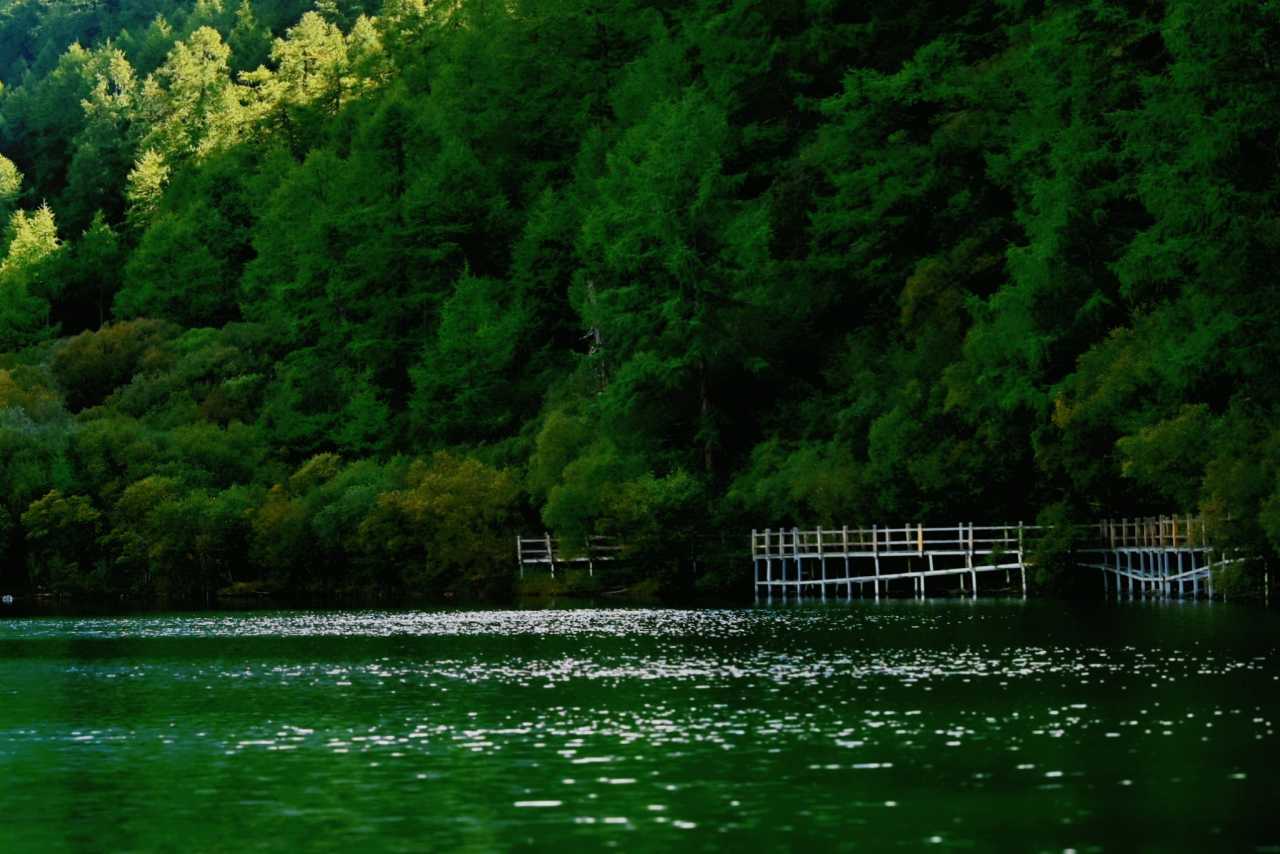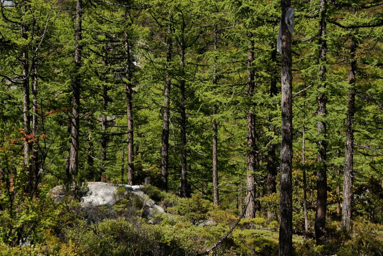 Daocheng Yading Scenic AreaUp close, tall proud trees weave a deep canopy, sifting flowing, mottled light.