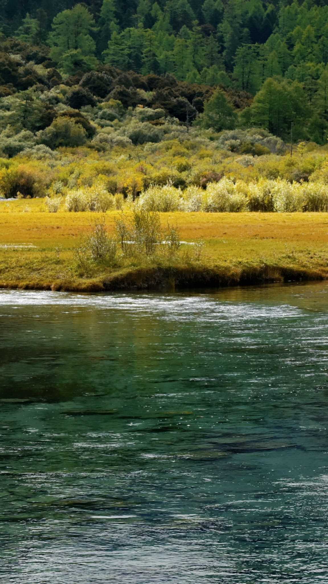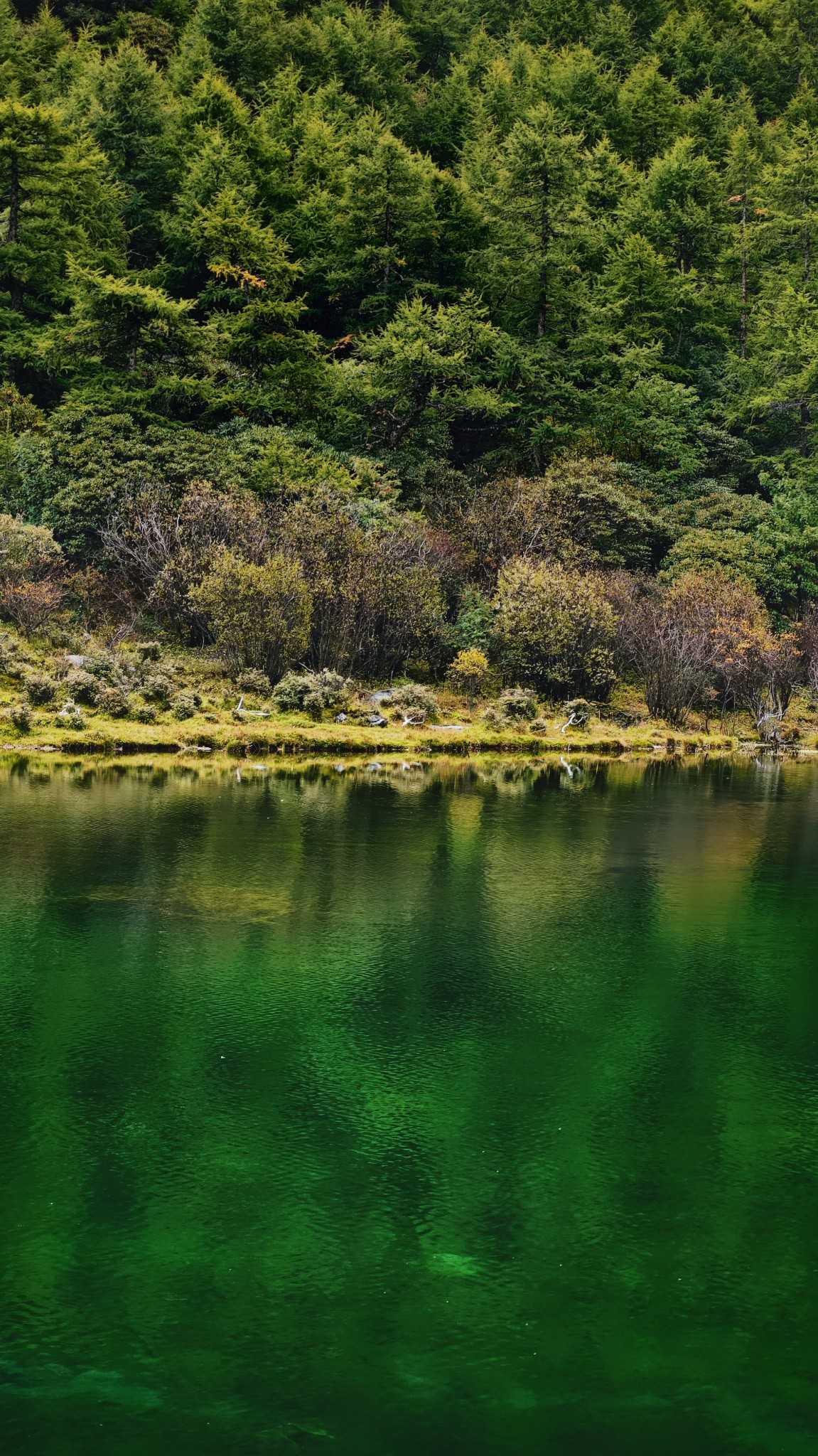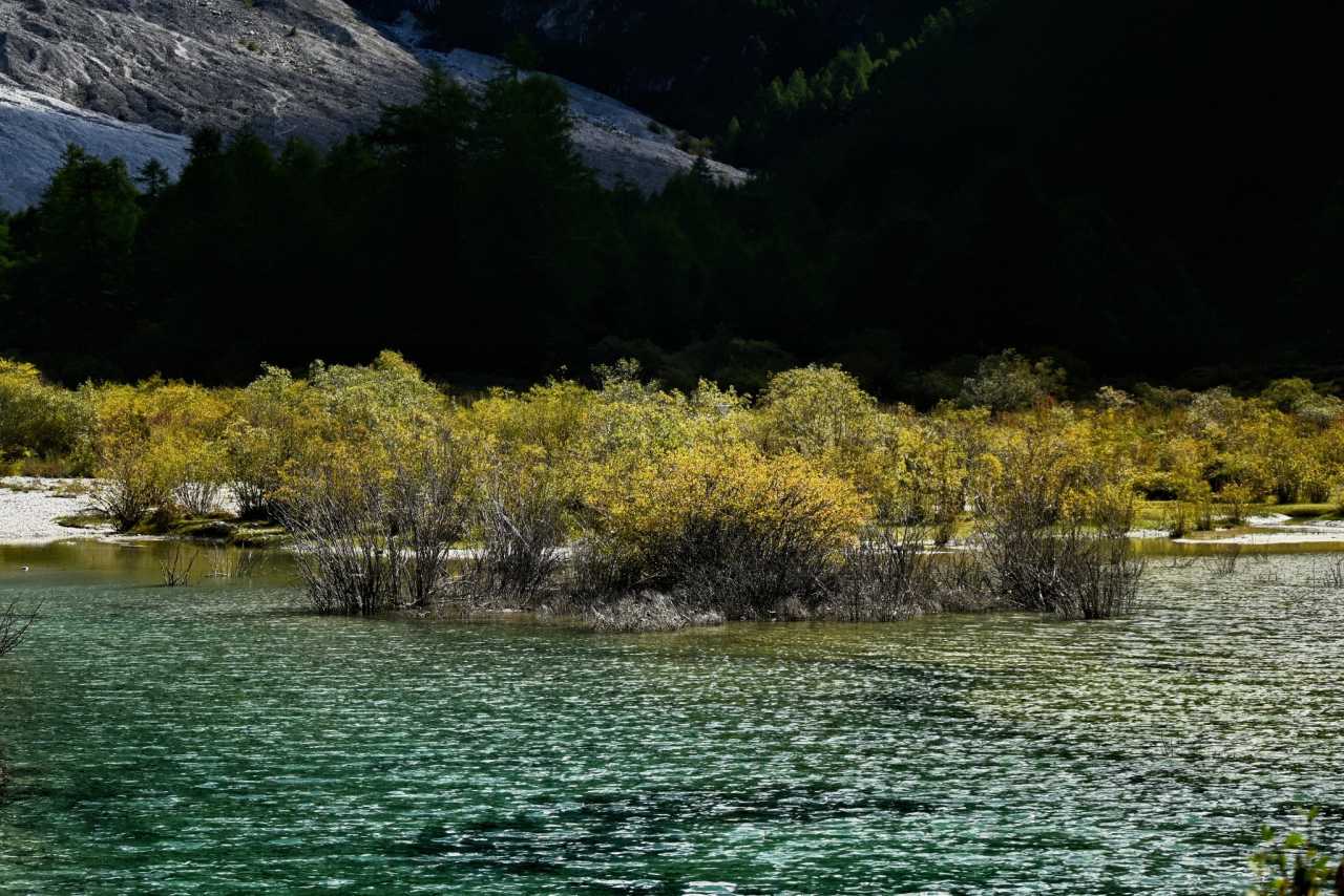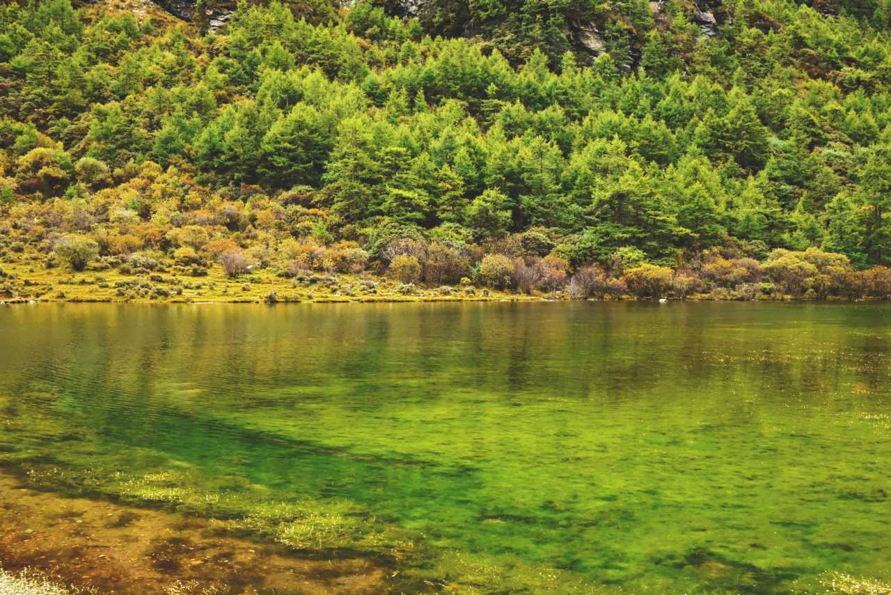 Daocheng Yading Scenic AreaUp close, tall proud trees weave a deep canopy, sifting flowing, mottled light.