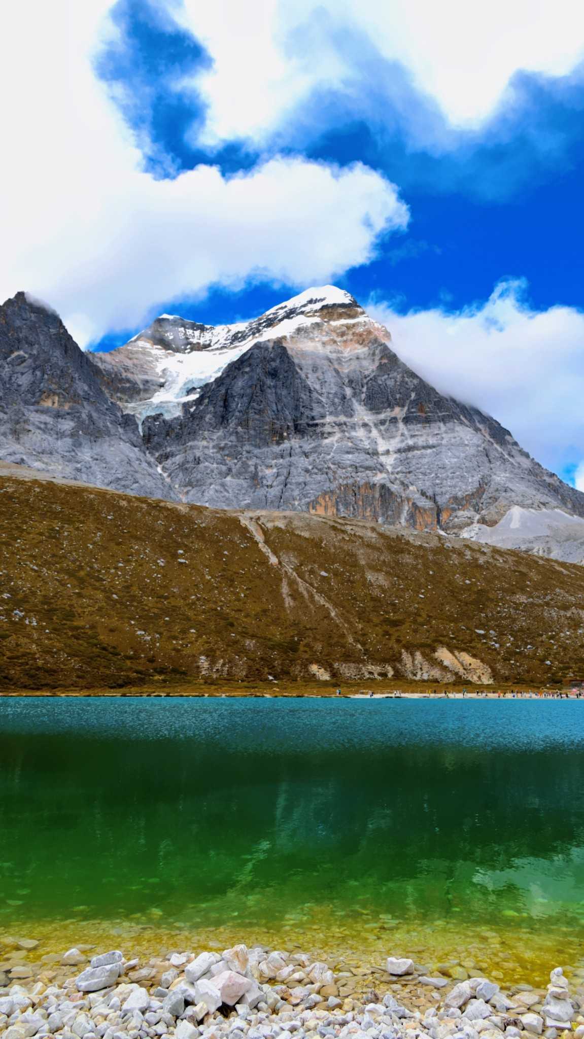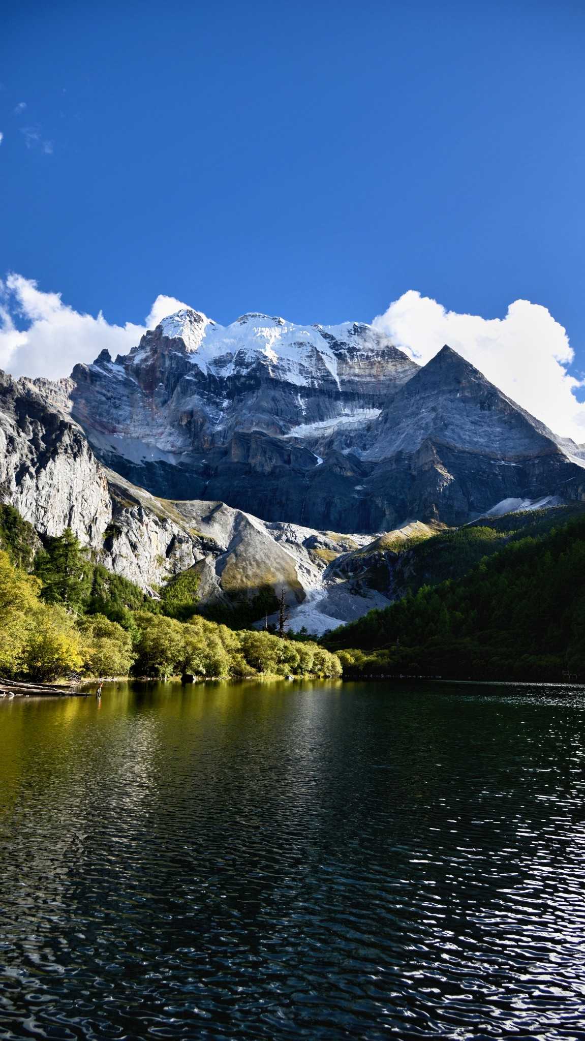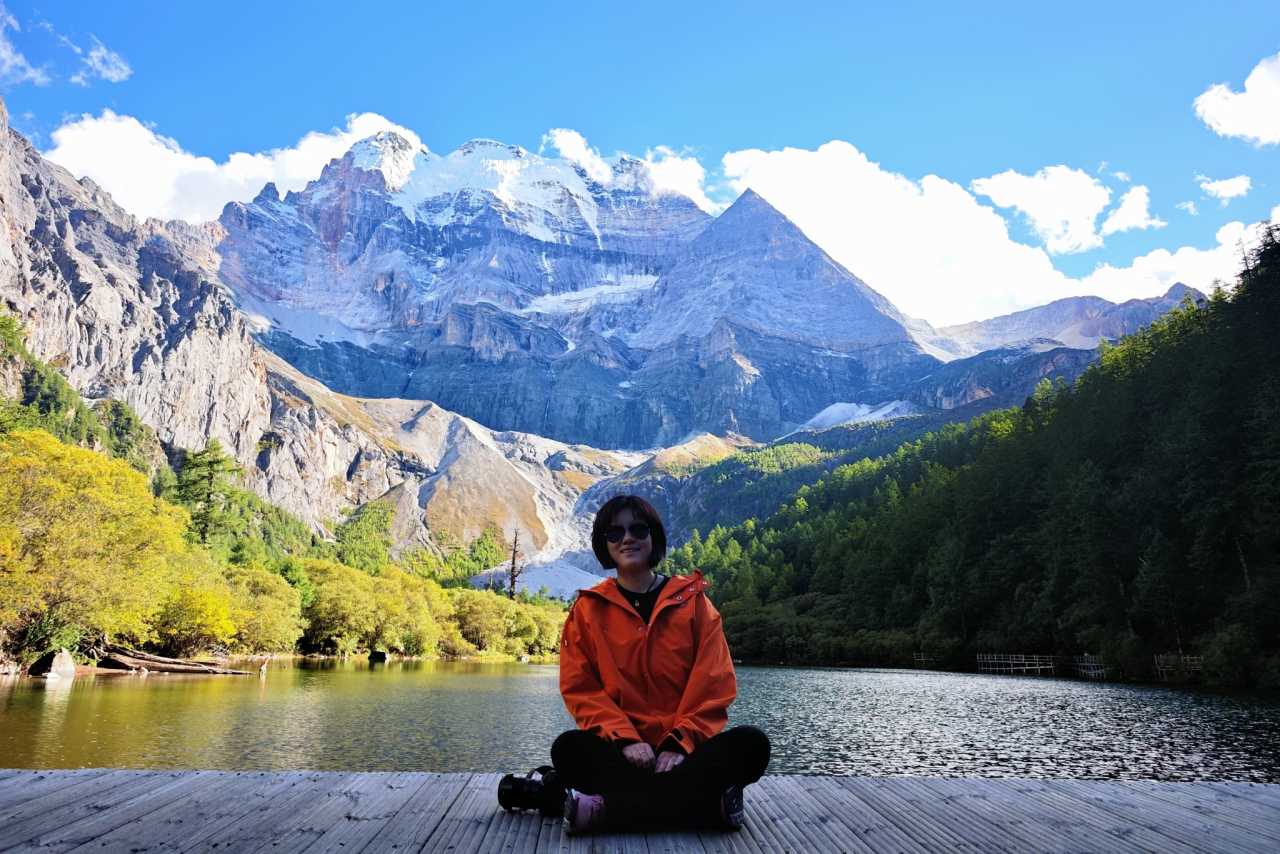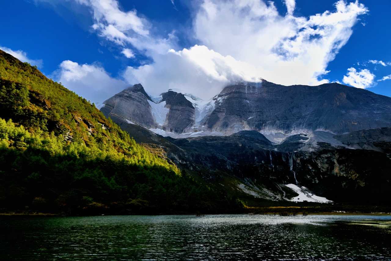 Autumn in Daocheng Yading is alpine lakes bathed in gentle breeze atop the mountains. The ripples no longer bitterly cold; they make the azure softer. The lake calms like glass, soaking in drifting clouds, snowy summits, and golden sunlight—even ripples left by wind shimmer with heart-soothing blue.
