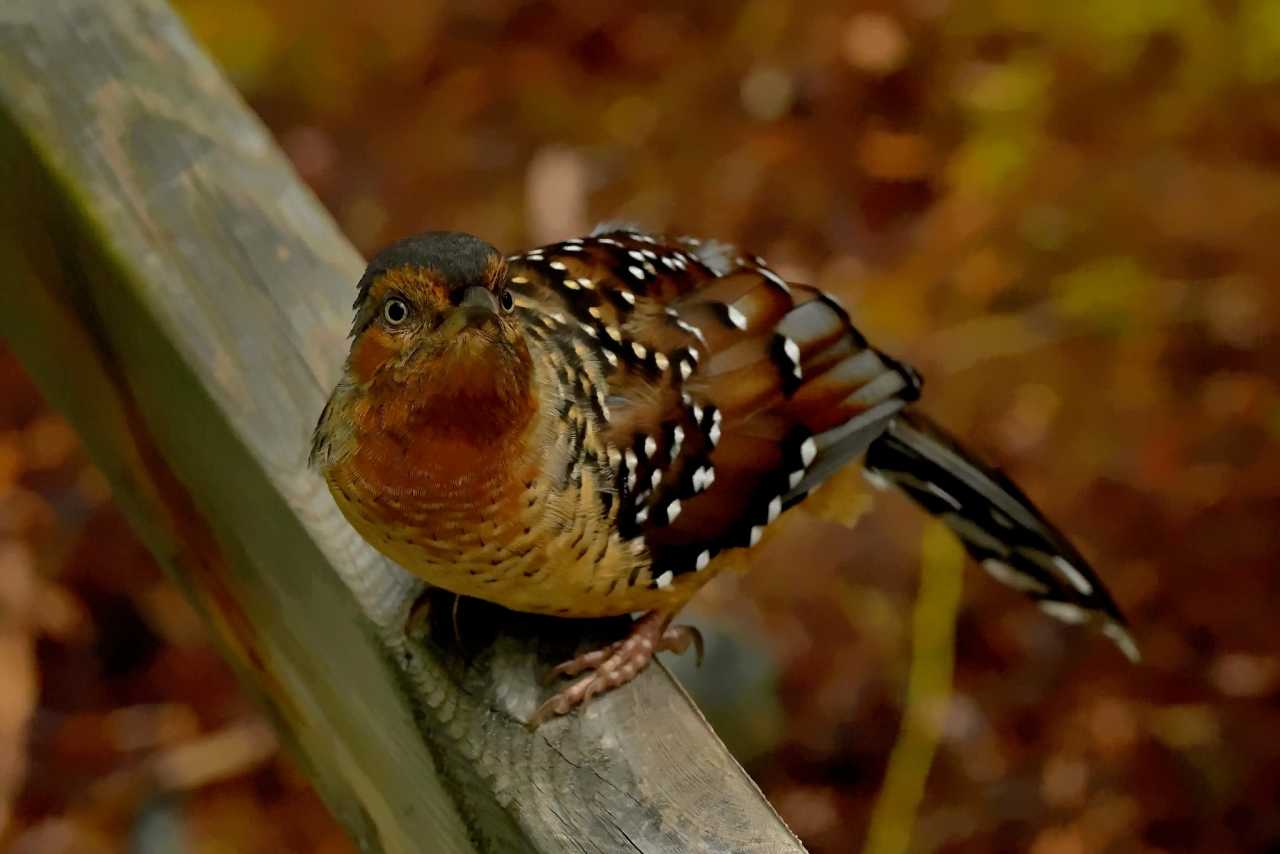Suddenly, a quick shadow darts under mottled light—likely a glossy squirrel with bold black eyes, round body like a breathing pinecone.