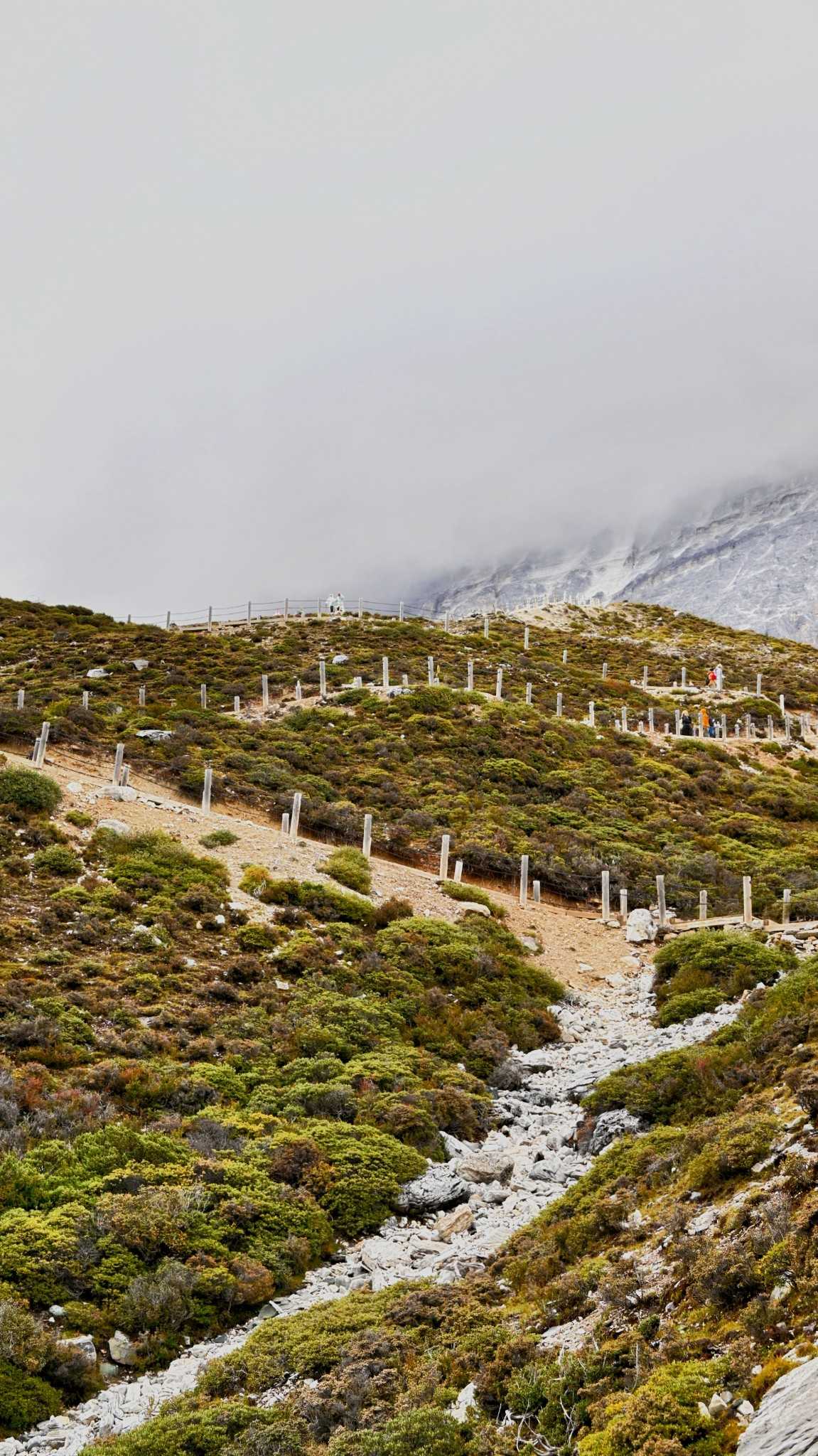 Thankfully, our old mantra “since we’re here” anchored us. Highland weather flips fast—downpour one moment, clear the next. From the platform to Milk Sea the route eases to trail—but rain turned it slick mud. Some sections are under slope-side construction—nets and machines narrow the way to single-file; puddles and stones complicate footing.