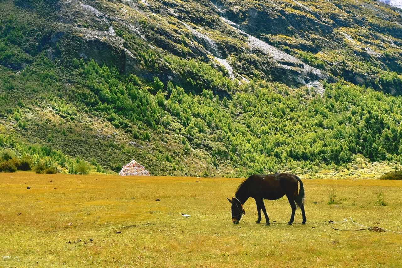 A short walk forward is Chonggu Meadow. Perfectly placed, it is the passage to Chonggu Monastery, the foot of Xiannairi, and Luorong Pasture—the junction of three routes. You’ll pass it for sure.