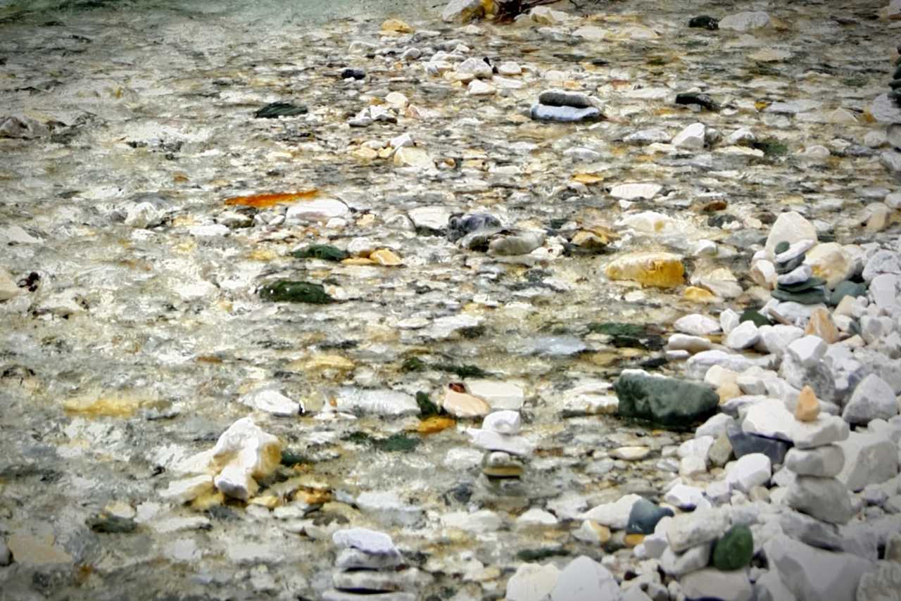 Milk Sea2) Opposite stone beach—quieter but needs wading. The “path” is merely larger stones forming a slick “bridge”—be careful; the calm angle and reflections are worth it.