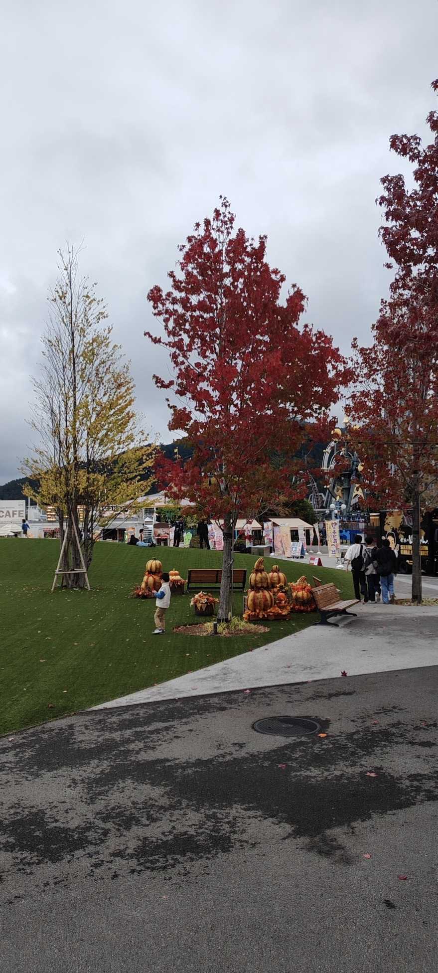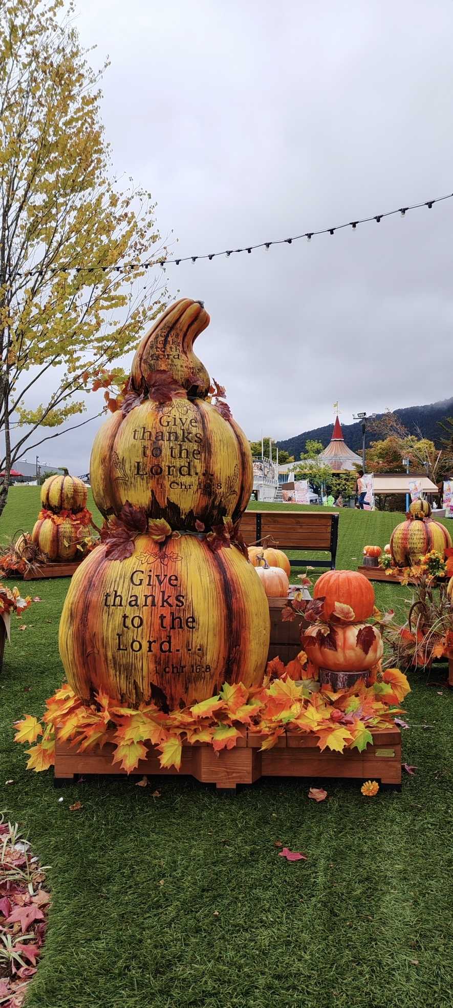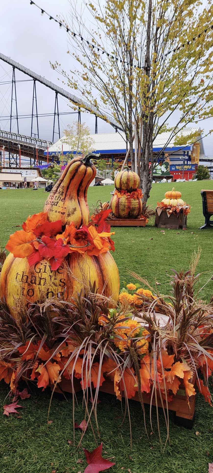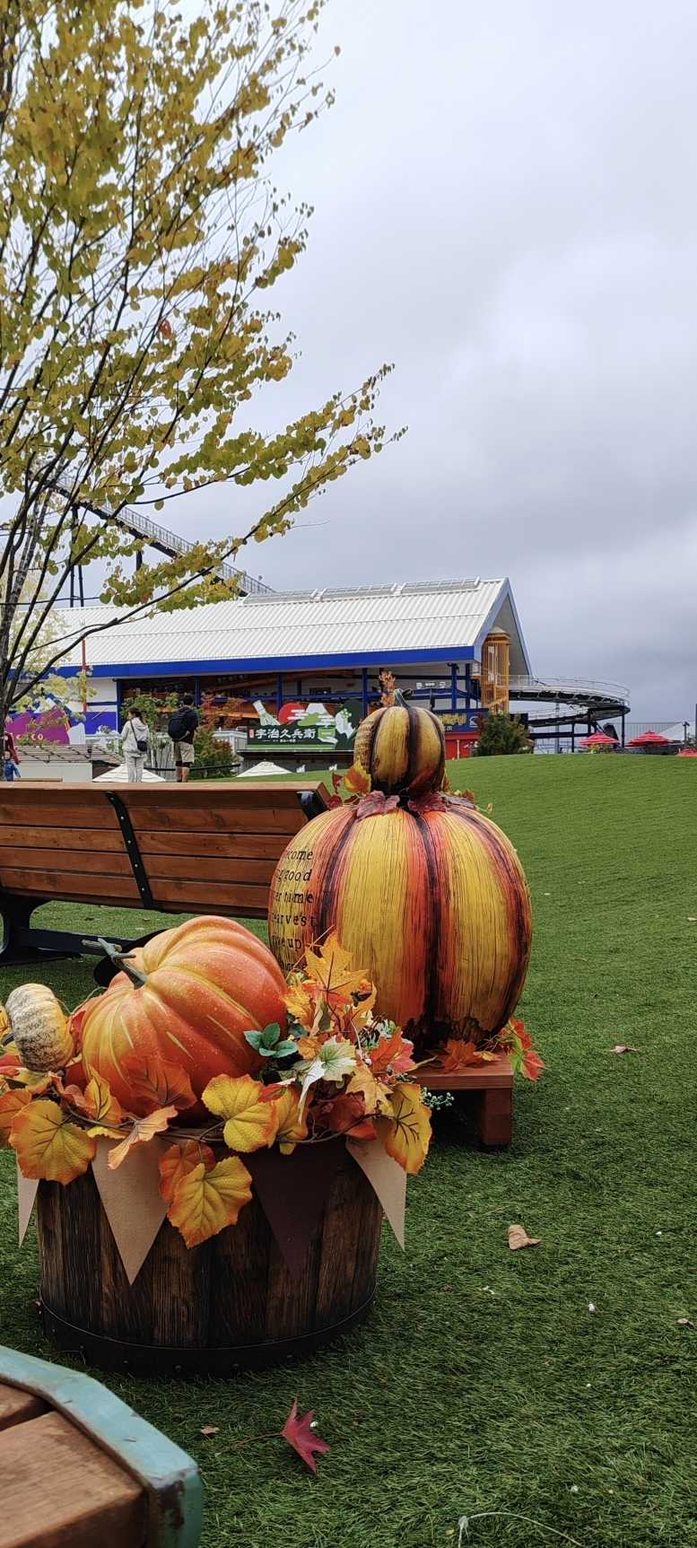 On the artificial turf, there were displays shaped like gourds and pumpkins.