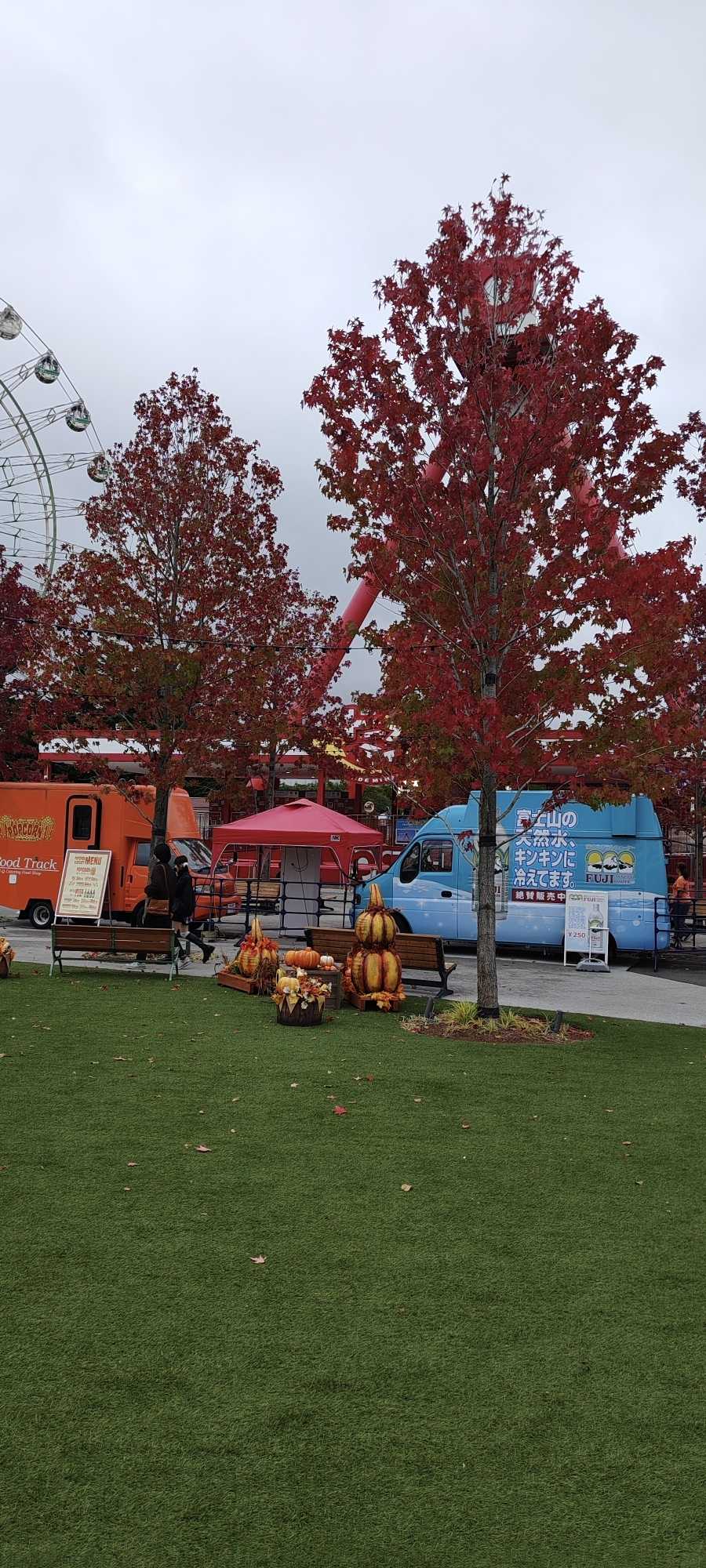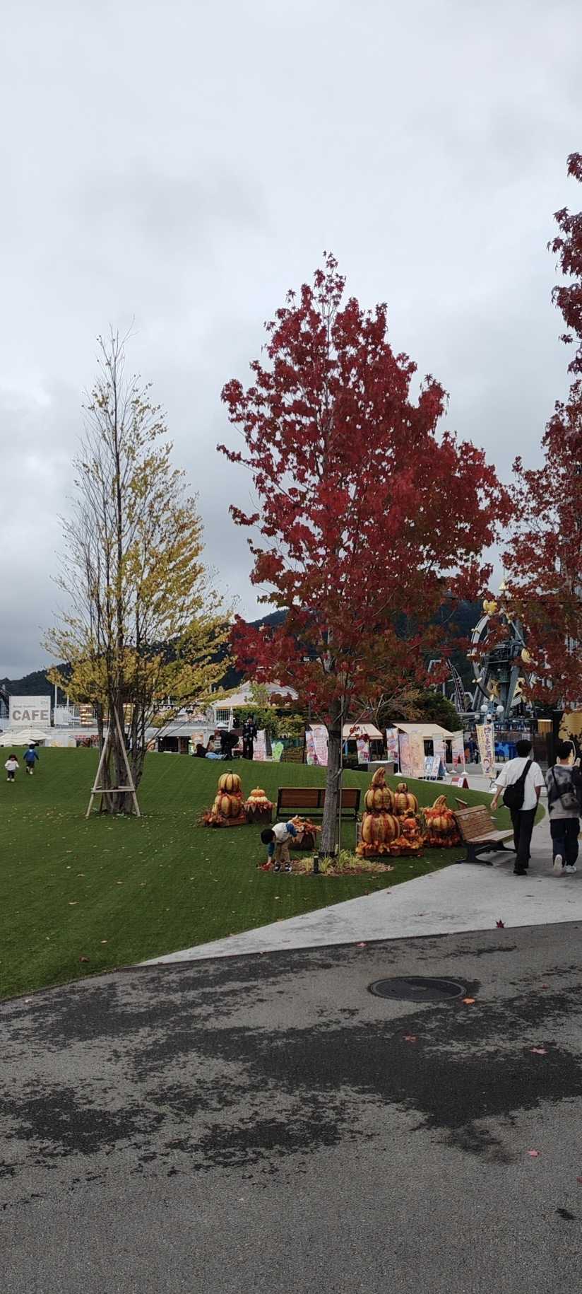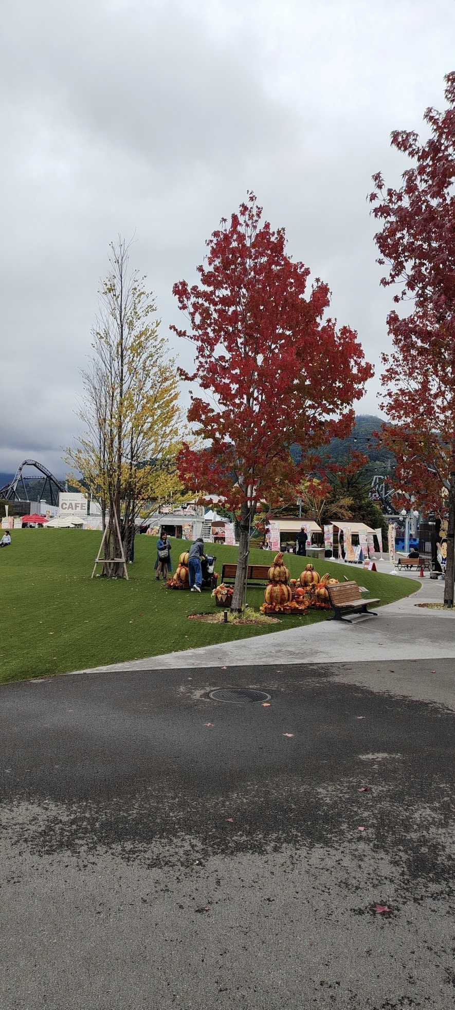 On the artificial turf, there were displays shaped like gourds and pumpkins.