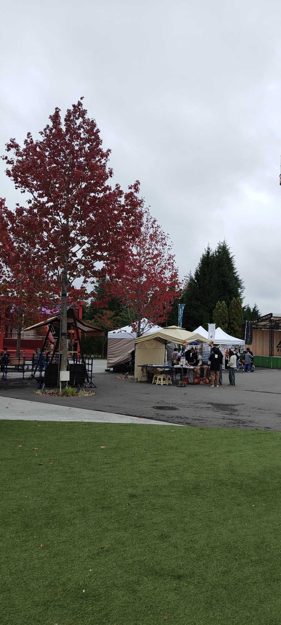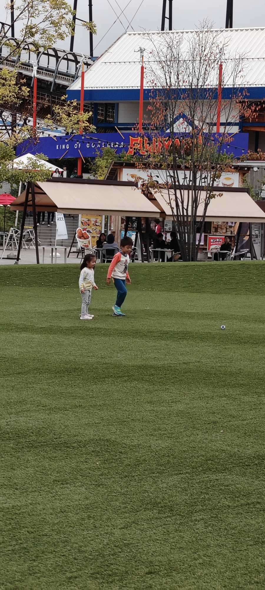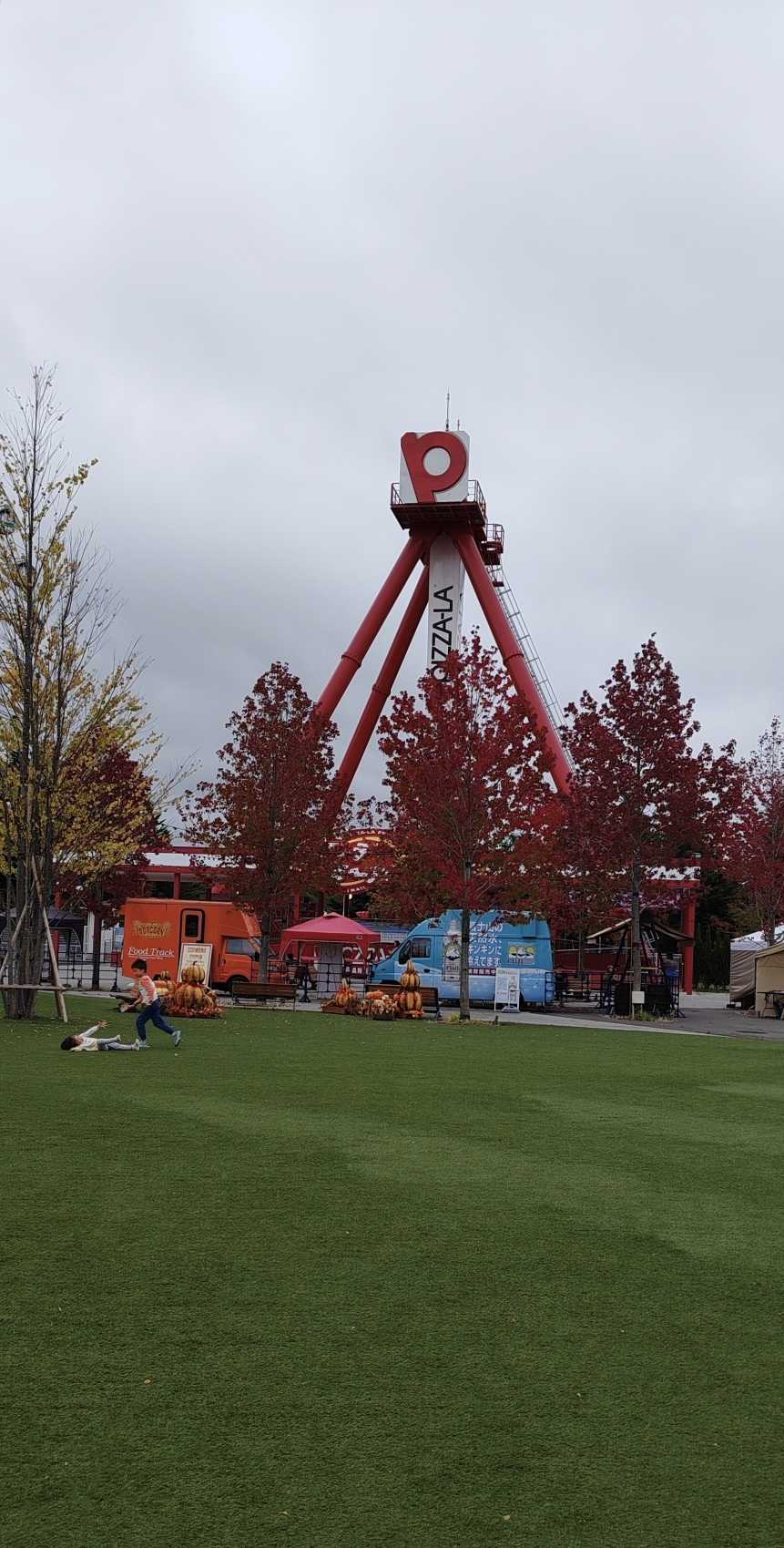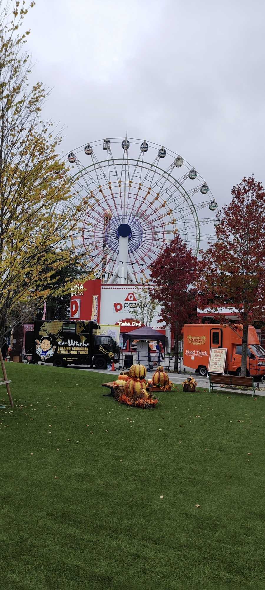 On the artificial turf, there were displays shaped like gourds and pumpkins.