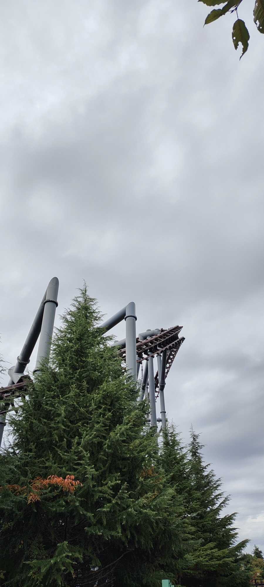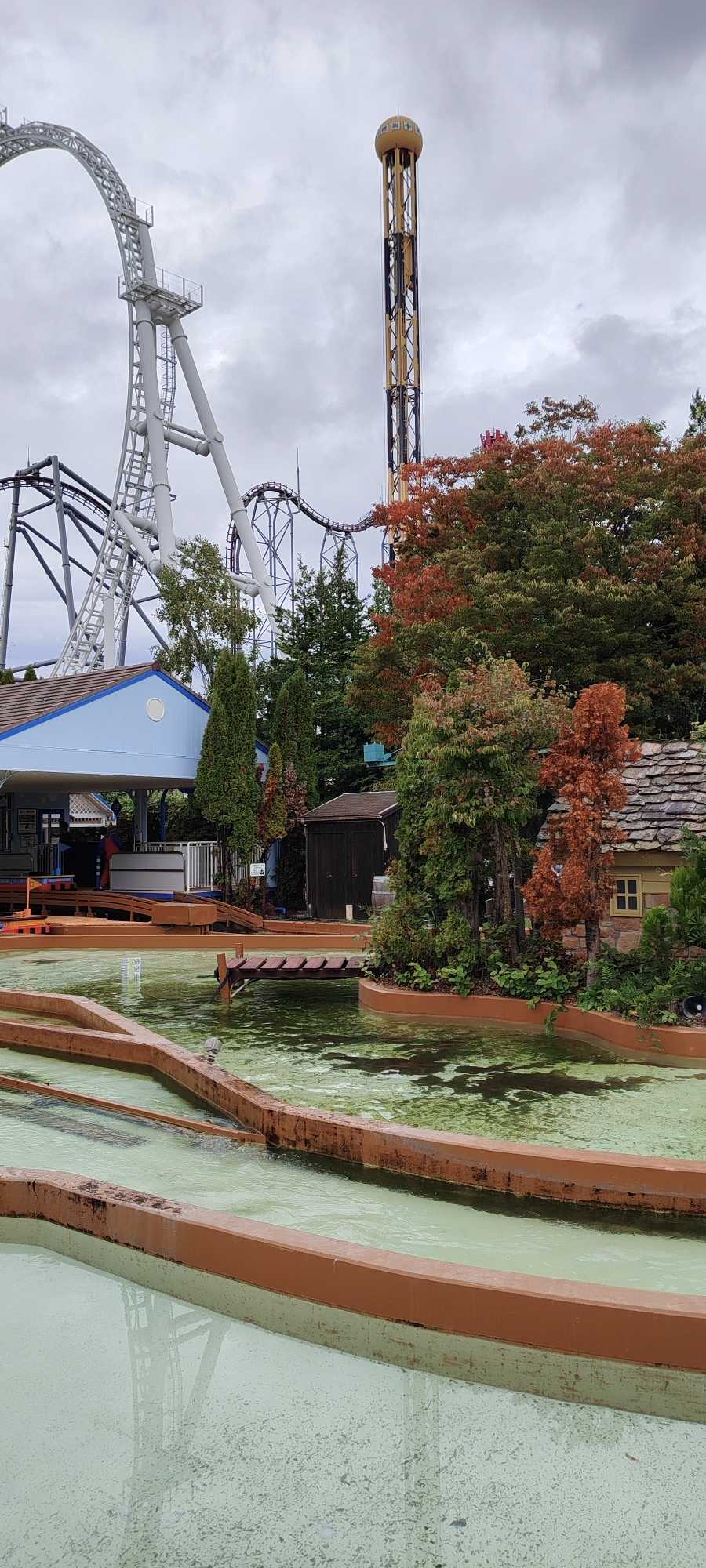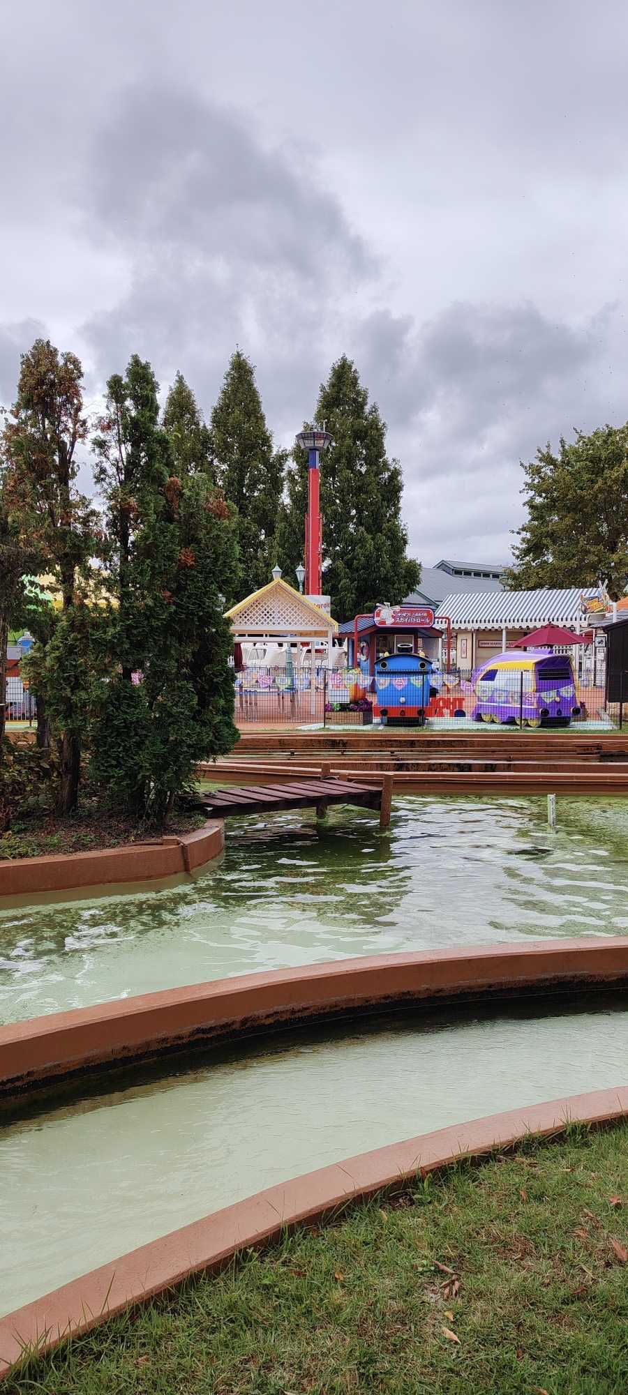 The forecast said there would be rain today. After we played half of the rides in Thomas Land, a light drizzle began.