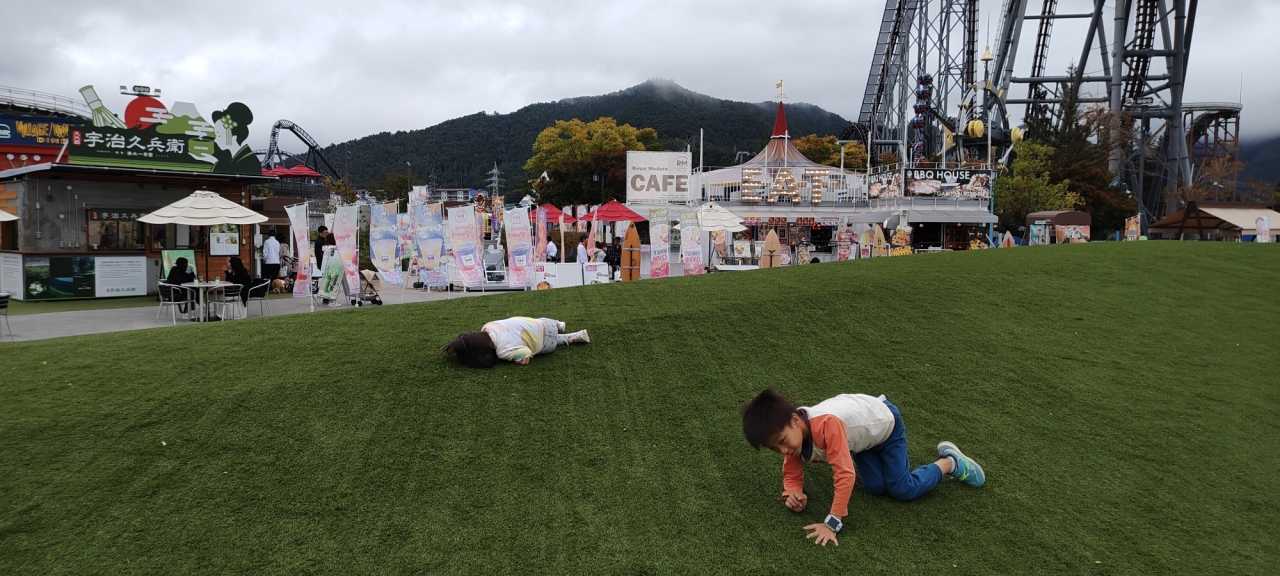 The grandson and granddaughter rolled on the lawn and ran around wildly.