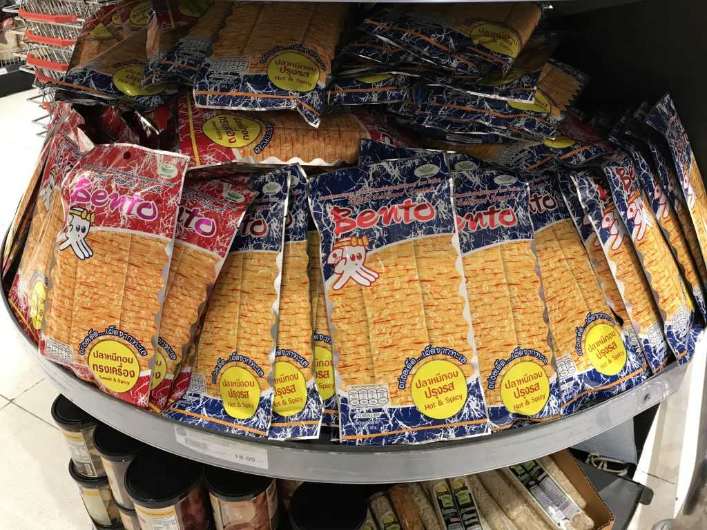 It’s a brand everyone recognizes, but in Thailand there are more varieties than in China — seaweed rolls, sheets; flavors include original, tomato, spicy, squid, tom yum, seafood, etc. It’s also cheaper than in China. Many visitors buy it by the box.