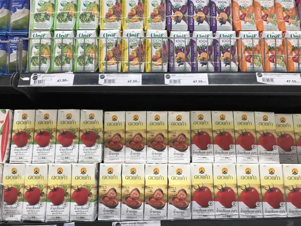 Thailand produces all kinds of tropical fruits, which are super fresh — their juices are delicious too! Recommended brand: DOI KHAM, founded by the Thai Royal Project farm. The taste is particularly rich!