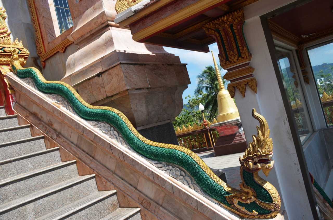 Wat ChalongStair rails are styled as dragons, though they look a bit serpent‑like without claws.