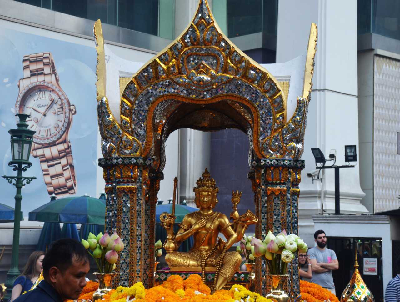 Erawan ShrineFrom BTS Chit Lom, walk ~100 m toward Siam to find Erawan Shrine right by the street. There are many Erawan shrines in Thailand; this is the most famous. Erawan (Phra Phrom) corresponds to the Hindu god Brahma. This shrine is said to be highly efficacious—with wishes granted. We didn’t pray at the time to avoid the obligation to return, and we regret that now.
