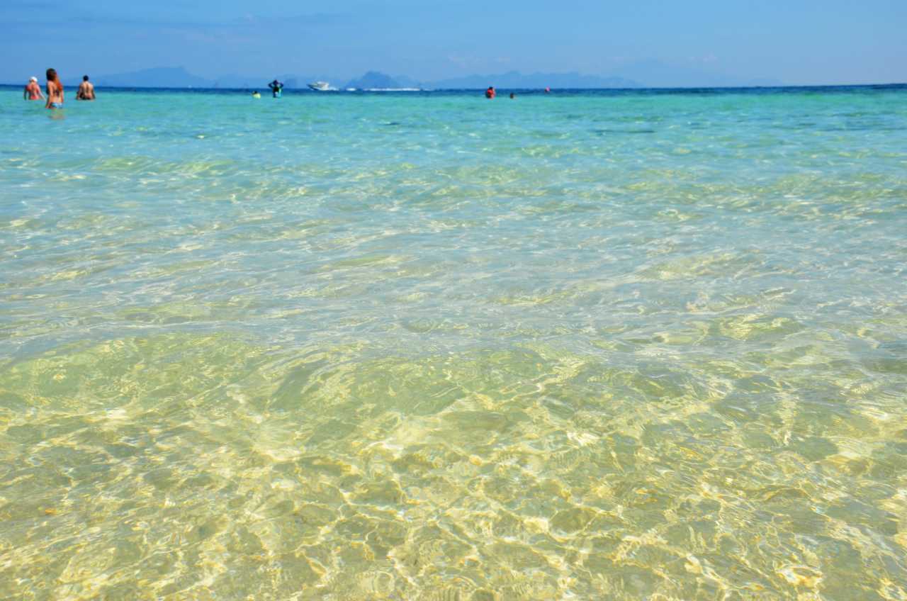 Maya BayFinal and main stop: Maya Bay, encircled by cliffs on three sides with a narrow mouth, famous from Leonardo DiCaprio’s film “The Beach”. Its allure comes from emerald water, white sand, and towering cliffs creating isolation. At 2 pm it was crowded and the water was warm after a morning of sun. The white sandy bottom turns the nearshore water silky milky—swimming feels like a milk bath.