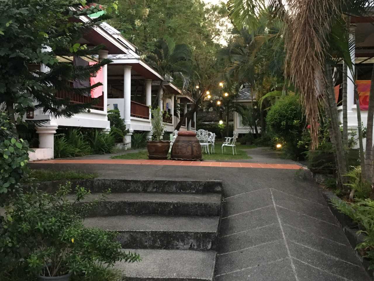 Each unit is a Thai‑style villa with Southeast Asian charm. Stray cats abound—great if you like cats.