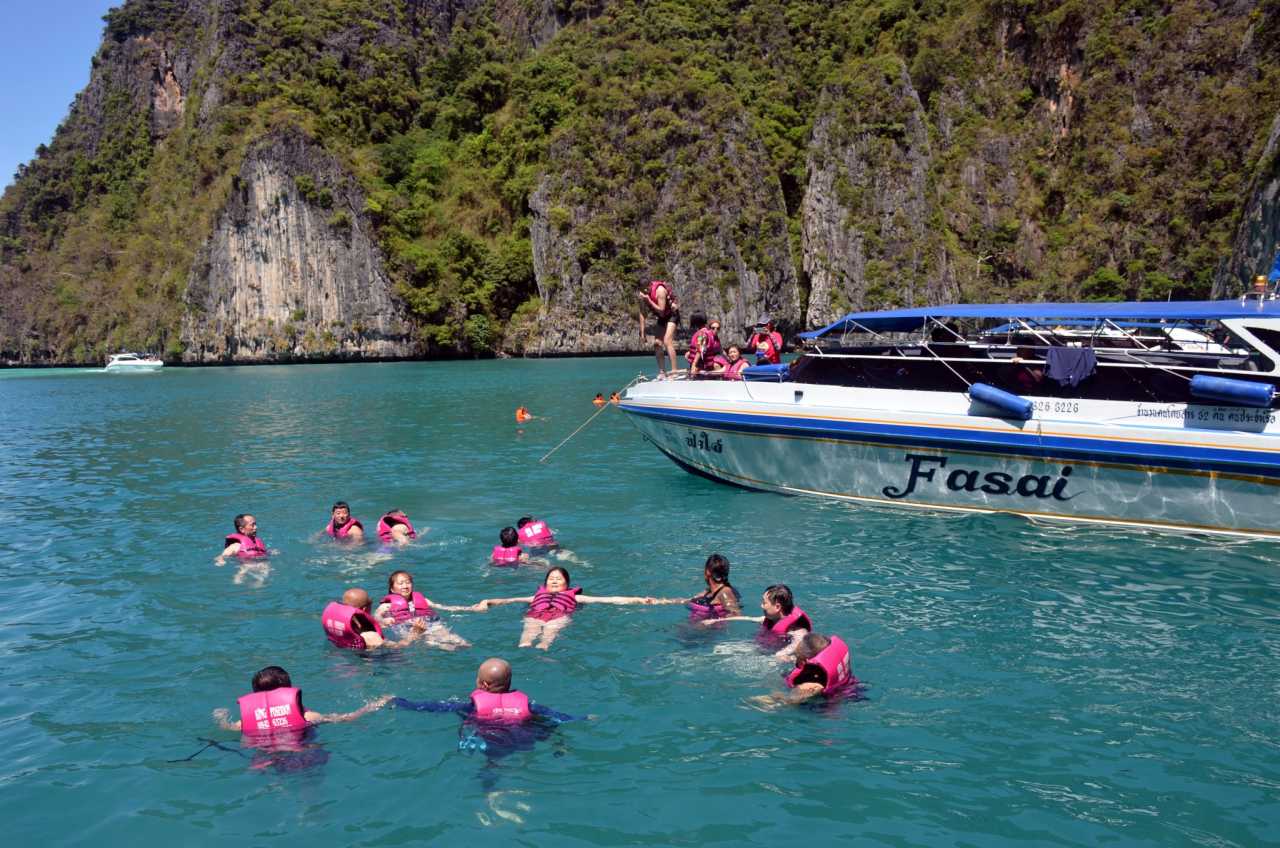 Phi Phi LehNext was swimming in Pileh Lagoon. Our child fell asleep and the boat was hot while anchored, so we fanned her to prevent heatstroke and skipped swimming.