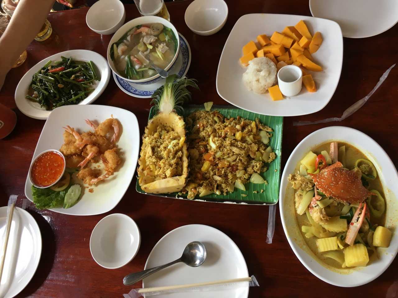 No.6 RestaurantWe ordered signatures: pineapple fried rice, curry crab, mango sticky rice, Tom Yum, shrimp and vegetables, plus drinks—710 THB. Tasty and reasonably portioned; great value. I prefer the hilltop branch. Shuttles depart when full; we finished and immediately had a ride, 10 minutes down to the old shop.
