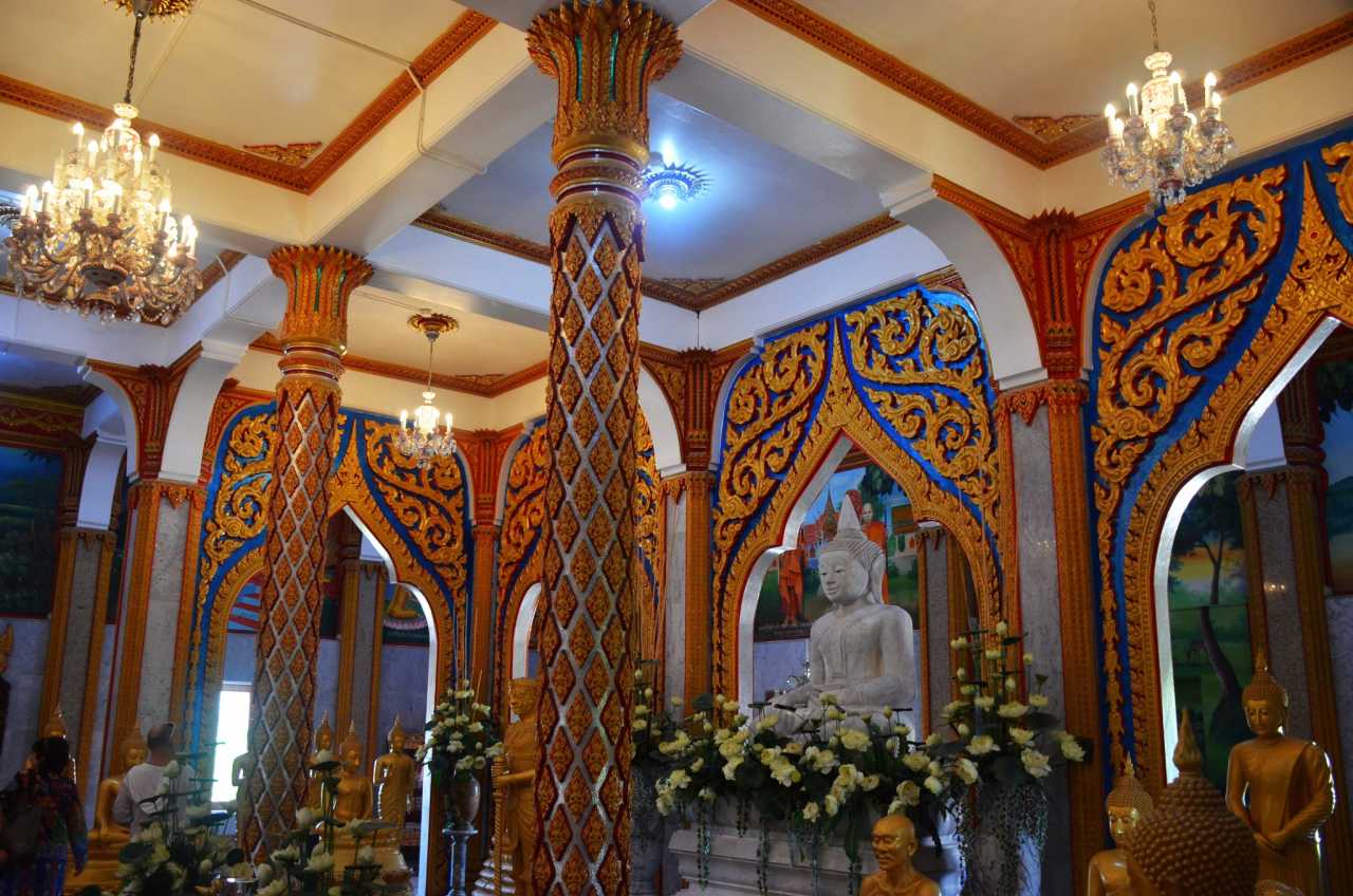 Wat ChalongInterior carvings are exquisite; the hall’s stone columns almost look pineapple‑like.