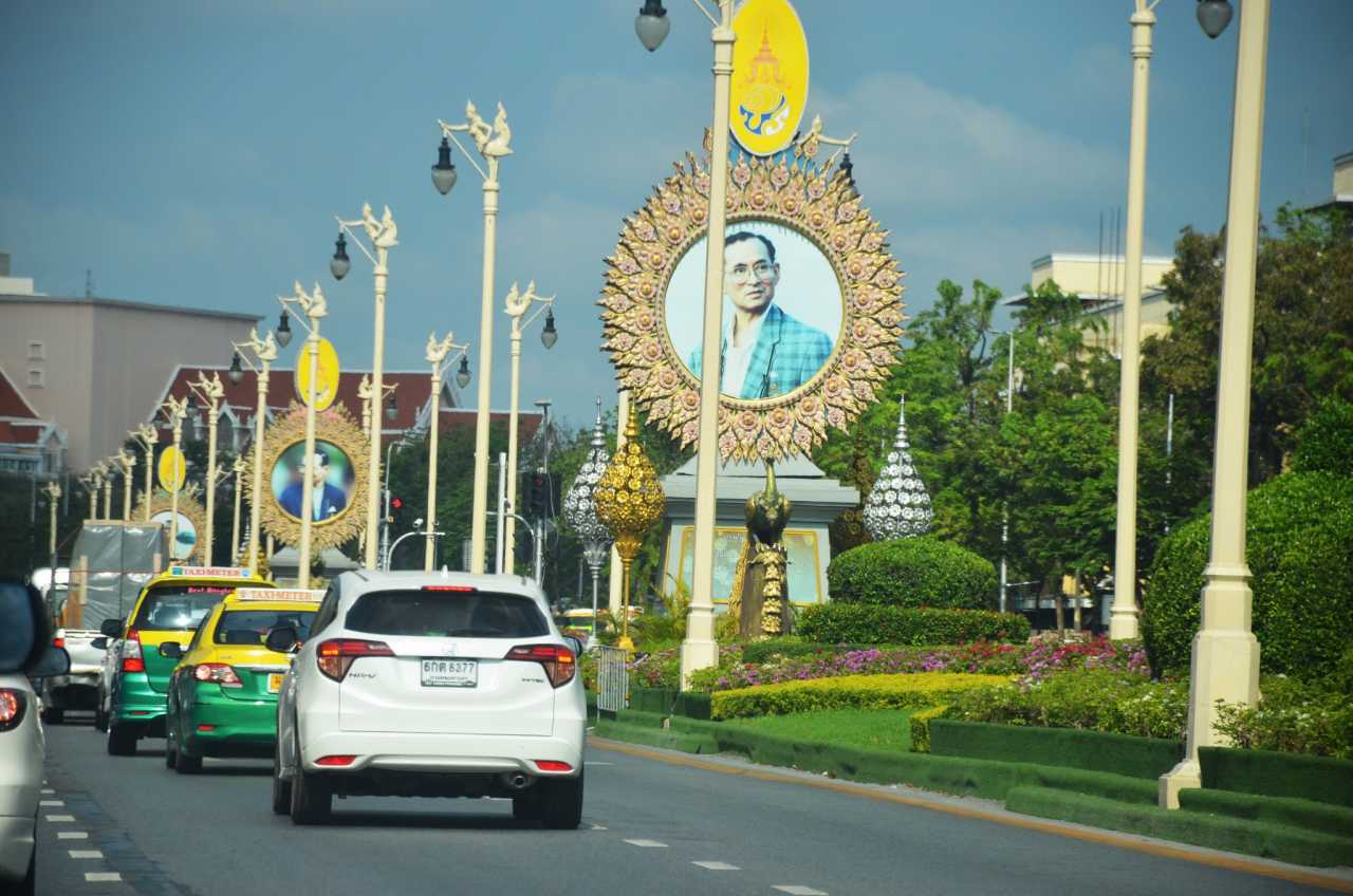 This looks like an important main street, lined with portraits of the late King Bhumibol, Thailand’s longest‑reigning monarch, revered nationwide.